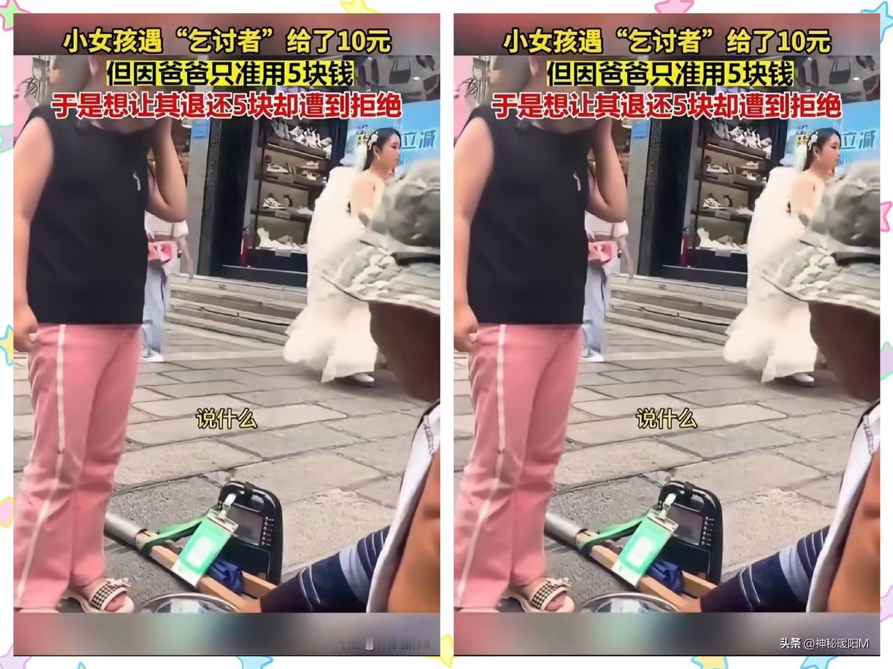 小女孩拿着10元q放在流浪汉碗里,对流浪汉说:”叔叔能不能找我5块,因为我爸爸只让我用5块。” 结果流浪汉装听不懂,只说着吉祥话不肯找零,孩子的小期待碎得稀碎!别觉得这是小事,孩子的善意是最纯粹的,敷衍式的回应不是温暖,是在浇灭这份珍贵的柔软。 善良从不是单方面的付出,被认真对待的善意,才能让孩子愿意一直温柔待世界。 你觉得该怎么回应孩子的这份纯良才不算辜负?