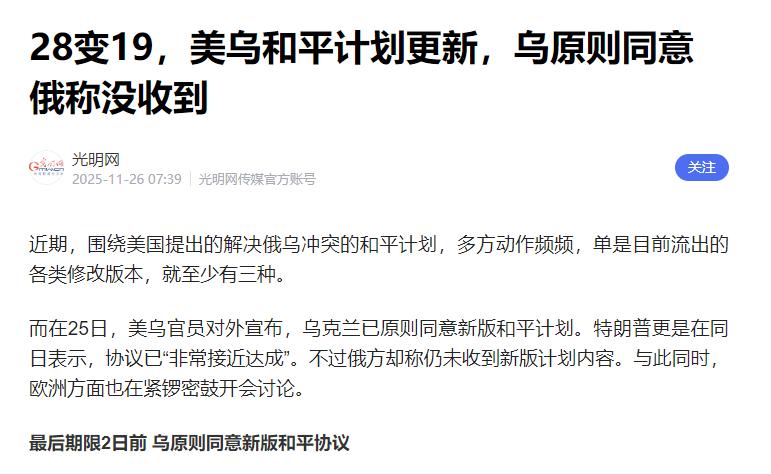 散了散了,乌克兰跪下了!乌克兰宣布同意签署和平计划了!但搞笑的是俄罗斯让它不许跪!   11月25日,根据美国官员接受美国“ABC新闻”时的通报称,目前乌克兰已经基本同意美国提出的和平协议的各项条款,但目前仍有一些条款的细节方面需要进一步商讨后才能最终敲定。也就是说乌克兰现在是真“跪”下来了,再屈辱的条件也得捏着鼻子认了。   乌克兰这两年多的仗打下来,早就没了当初的锐气,能撑到现在全靠一口气吊着,如今这口气终于顶不住了。   俄罗斯国防部长绍伊古早就公布过数据,自特别军事行动开始,乌军损失人数已经超过44.4万,光是2024年8月的库尔斯克战役,乌军就损失了7800多名军事人员、75辆坦克和507辆装甲车,这样的消耗速度就算是人口大国也扛不住。   乌克兰的兵源已经枯竭到了离谱的地步,原本25到60岁的男性强制服兵役,后来直接把征兵年龄下调到25岁,甚至连18岁到60岁的男性都被禁止出国,可就算这样还是招不到足够的兵。   基辅的征兵人员跟抓壮丁似的,在摇滚音乐会现场、购物中心、餐馆里突袭搜查,只要男性拿不出免除兵役的证件,就被强行拖去军营,有视频拍到被抓的人挣扎着大喊“离我远点”,场面实在难看。   为了逃避服役,不少乌克兰男性冒着生命危险越境,自冲突爆发以来,至少有30人在越境路上溺水或冻死,还有人注销银行账户、转移财产,就为了躲开征兵罚款和强制服役。   民调显示近一半乌克兰人觉得逃避兵役并不可耻,超过四成的人认为早就该和俄罗斯和谈了,军心民心都散了,这仗怎么还能打下去。   更让乌克兰撑不下去的是西方援助断了档,美国五角大楼早就用完了国会划拨的援乌资金,从去年12月起就没法再提供急需的武器弹药,而欧洲搞的“火炮联盟”看着热闹,实际能兑现的没多少。   法国承诺的72门车载榴弹炮,还有一半的资金没凑齐,北约签署的155毫米炮弹合同,要到2026年初才能交付首批,远水根本解不了近渴。   乌克兰外长库列巴都忍不住抱怨,西方国防工业根本生产不出足够的弹药,而乌克兰空军发言人更直接,说就算囤积再多武器也没用,俄军总能精准摧毁弹药库。   没了弹药补给,前线士兵只能硬扛,许多人已经连续服役两年多,连轮换的机会都没有,疲惫不堪的他们早就没了战斗热情。   乌克兰武装部队总司令瑟尔斯基私下都坦言,不相信能获得胜利,甚至赞同签署停火协议,高层都没了信心,底下的士兵自然更没斗志。   在这种情况下,美国抛出的“28点新计划”就算满是屈辱条款,乌克兰也只能接住,毕竟再不同意,可能连谈判的资格都没了。   这份计划里不仅要求乌克兰从顿涅茨克部分地区撤军,还涉及安全保障、经济重建等一系列由美国主导的条款,甚至隐约提到要让乌克兰出让关键矿产资源开采权,来抵消美国的援助成本,这样的条件放在以前乌克兰绝对会拍桌子拒绝,但现在只能点头认账。   可俄罗斯这边偏不按常理出牌,面对乌克兰递过来的“投降书”,压根不接茬。   俄罗斯总统新闻秘书佩斯科夫直接表态,俄方还没收到更新版的和平计划,虽然对美国提出的计划持开放态度,但必须基于俄方的核心诉求来谈。   俄罗斯心里门儿清,现在战场主动权在自己手里,俄军已经牢牢掌控各条战线,还在持续推进,没必要接受一份由美国主导、没满足自己核心利益的协议。   俄罗斯的诉求从来都很明确,要求乌克兰承认克里米亚及东部四州的现状,承诺不加入北约,并且大幅削减军事力量,这些都是关乎俄罗斯地缘安全的底线。   之前在伊斯坦布尔的直接谈判,就是因为双方在领土和安全问题上分歧太大,最后只交换了1000名战俘,没取得任何实质进展。   现在美国搞的这份和平计划,明显是想把欧洲安全框架攥在自己手里,甚至预留了北约扩展的接口,这根本触及不到俄罗斯的核心关切。   对俄罗斯来说,乌克兰愿意签字认输是好事,但必须按俄罗斯的规矩来,不能让美国借着和平协议插手东欧安全格局。   毕竟现在的情况是,俄罗斯越打越从容,而乌克兰已经耗到了极限,俄罗斯有的是时间慢慢谈,自然不会急着接受一份“打折”的和平协议。   乌克兰这下可真是骑虎难下,想对着美国跪下求和平,却被俄罗斯拦着不让跪,活成了大国博弈里最尴尬的角色。   自己的领土要被拿来做交易,国家的安全要靠别人保障,连和平协议都得看美俄两国的脸色,这哪里是主权国家该有的样子。   当初跟着西方喊着要“战斗到最后一人”,如今却落得个兵源枯竭、援助中断、只能被动接受屈辱条款的下场,而就算这样,想要的和平还得看俄罗斯答不答应。