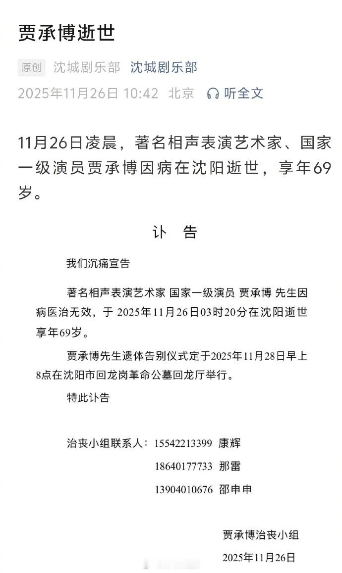 贾承博去世著名相声表演艺术家贾承博去世 著名相声表演艺术家、国家一级演员贾承博先生11月26日凌晨在辽宁沈阳因病逝世,享年69岁。贾承博先生遗体告别仪式定于2025年11月28日早上8点在沈阳市回龙岗革命公墓回龙厅举行。