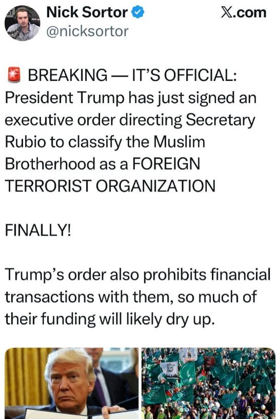 突发消息,正式确认: 川普总统刚刚签署行政令,指示 Rubio 国务卿将 Muslim Brotherhood 列为外国恐怖组织。 终于成真! 该命令还禁止与其进行任何金融交易,因此其大部分资金可能会迅速枯竭。 这事儿可不是临时起意,共和党人早就憋着这股劲儿,特朗普首个任期就想推动却没成。 如今第二任期刚开锣几个月,他就把这事儿提上日程,动作快得让人始料未及。 行政令里写得明明白白,特朗普直接点名国务卿马尔科·鲁比奥和财政部长斯科特·贝森特。 他要求这两位官员赶紧提交报告,给黎巴嫩、埃及和约旦等地的穆兄会分会定性。 美国政府给出的理由很直接,他们指责这些地区的穆兄会派系没少搞事情。 一会儿支持对以色列和美国伙伴的暴力袭击,一会儿又给哈马斯输送物资支持,桩桩件件都踩在美国的红线里。 说起穆斯林兄弟会,这可是阿拉伯世界里响当当的角色。 它打20世纪20年代在埃及成立后,就一直以秘密运作的方式发展,是最古老也最有影响力的伊斯兰政治组织之一。 这次特朗普政府动真格,最狠的招就是金融封锁。 行政令明确禁止与被列名的穆兄会分支进行任何金融交易,这一下就掐住了对方的钱袋子。 要知道这类组织的运作全靠资金支撑,这么一来,他们的大部分资金恐怕很快就要枯竭。 鲁比奥之前就放话,说特朗普政府正全力推进给穆兄会定性的工作。 现在行政令一签,算是把这话落到了实处,也圆了共和党多年的夙愿。 不过这事儿在国际上肯定会掀起不小的波澜。 穆兄会在多个中东国家都有盘根错节的关系,突然给其分支扣上恐怖组织的帽子,可能会影响地区稳定。 埃及政府对穆兄会的态度一直很强硬,之前就没少打击该组织。 美国这次的举动,说不定能得到埃及等国的暗中支持,但也会让一些伊斯兰国家产生抵触情绪。 有分析人士指出,特朗普这么做,既有国内政治考量,也想在中东事务中刷一波存在感。 共和党选民里不少人对伊斯兰极端组织持强硬态度,这步棋能帮他巩固基本盘。 同时,美国也想通过打压穆兄会分支,削弱其在中东的影响力,进而加强对该地区的掌控。 但事情远没那么简单,穆兄会的复杂性远超想象。 它既有政治活动的一面,又有部分分支涉及暴力行为,如何精准界定打击范围是个难题。 要是打击面太广,很可能会引发无辜民众的不满,反而给极端势力可乘之机。 而且金融封锁虽然能切断资金来源,可也可能把一些分支逼入地下,变得更加难以管控。 国际社会对此也是看法不一,有些国家认为美国是在维护地区安全,有些则觉得这是在干涉他国内政。 联合国相关机构还没对此事表态,但不少人权组织已经开始担忧。 他们怕美国的制裁会波及普通民众,影响当地的人道主义救援工作。 哈马斯作为和穆兄会有渊源的组织,这次也被美国点名提及。 美国称穆兄会分支给哈马斯提供物质支持,这无疑会让巴以局势更加紧张。 以色列方面肯定乐见其成,毕竟哈马斯是他们的老对手,美国出手打压相当于帮了大忙。 可巴勒斯坦民众却可能因此对美国更加不满,觉得美国在巴以问题上始终偏听偏信。 现在鲁比奥和贝森特正忙着准备报告,具体哪些分支会被最终列名还不好说。 但可以肯定的是,这份报告一旦出炉,必然会在中东乃至全球引发新一轮的连锁反应。 特朗普这步棋走得究竟是对是错,恐怕要等一段时间才能看清。 毕竟在复杂的国际局势里,一个看似简单的行政令,背后牵扯的利益和风险实在太多。 各方势力都在盯着美国接下来的动作,这场围绕穆兄会定性的博弈才刚刚开始。