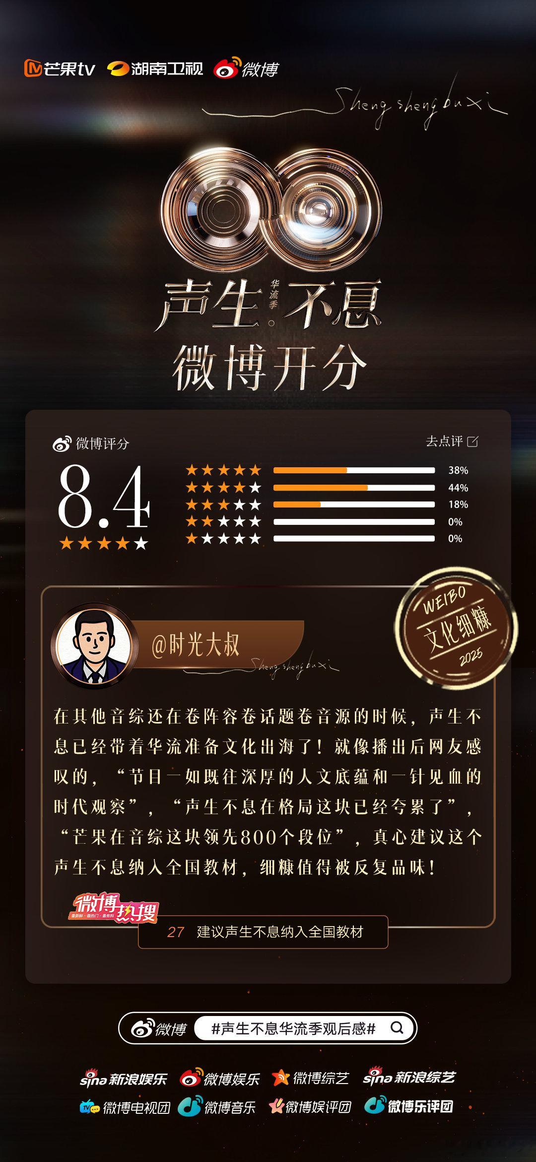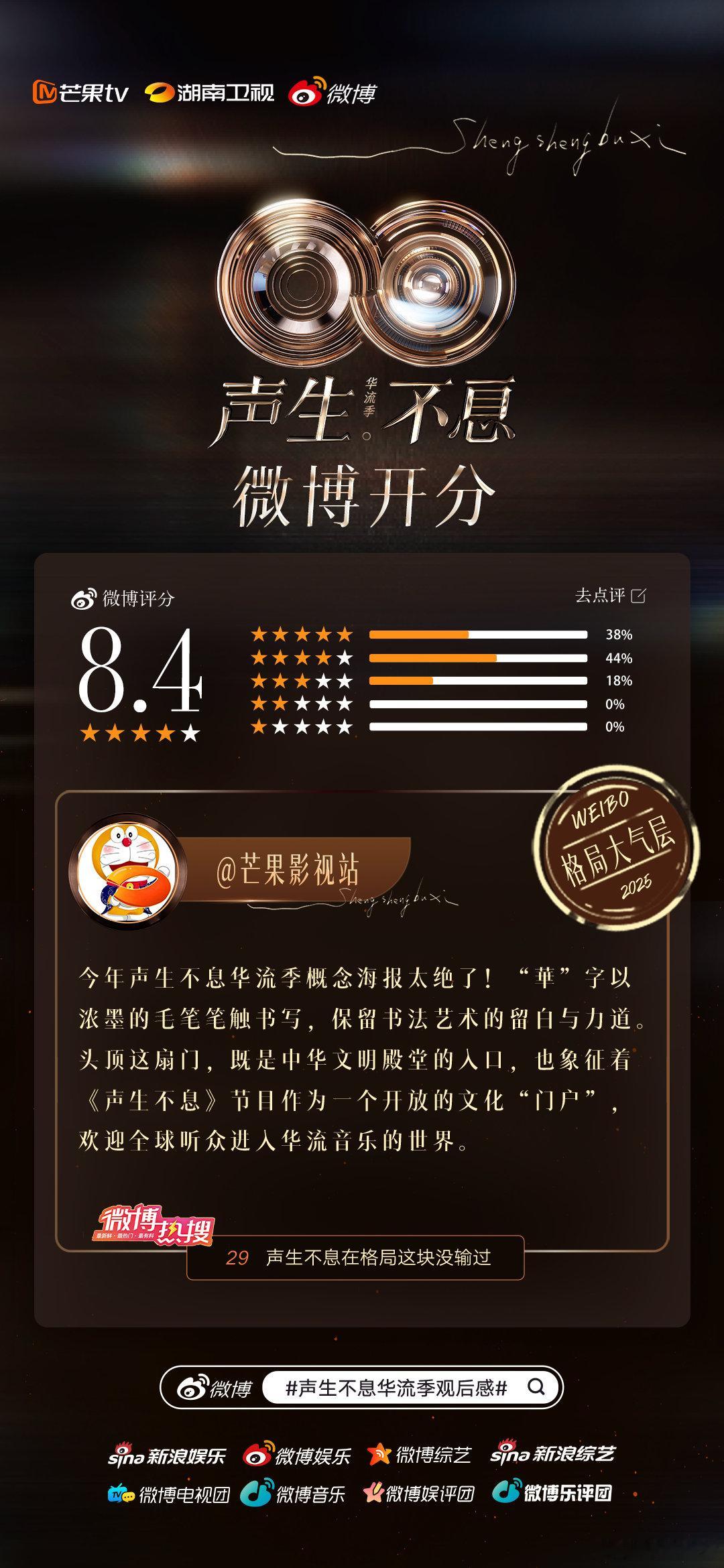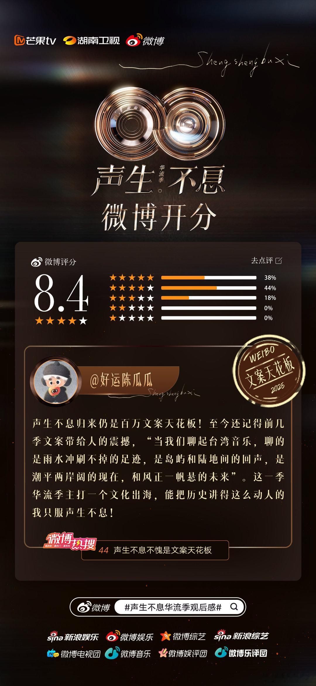声生不息华流季微博开分8.4 经典IP 强势回归,微博开分8.4成为同期在播音综开分TOP1!专业乐评人多维点评金曲舞台,追综网友实时畅聊,文化出海立意深远……带声生不息华流季观后感发博,更多精彩点评等你分享! 声生不息 每周五12:00芒果TV正片上线,20:10湖南卫视播出!