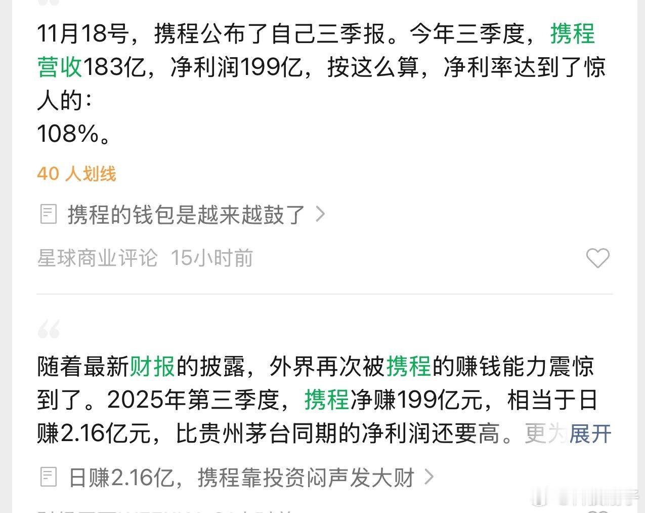 原来闷声发大财的是携程啊,25年的Q3财报出来了净利润赚了快200亿,日均入账2亿多。净利率更是高达108%!