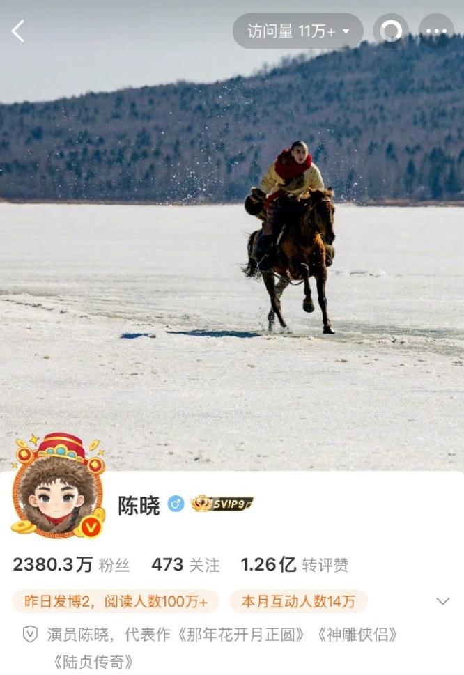 陈晓更换了11年的微博背景图 把当年和陈妍希的定情图换成了大生意人剧照,这么多年上了很多部剧都没舍得换,现在离婚了,终于可以彻底换掉了,他的代表作至今都写的是和孙俪的《那年花开月正圆》,和陈妍希的《神雕侠侣》,还有赵丽颖的《陆贞传奇》。