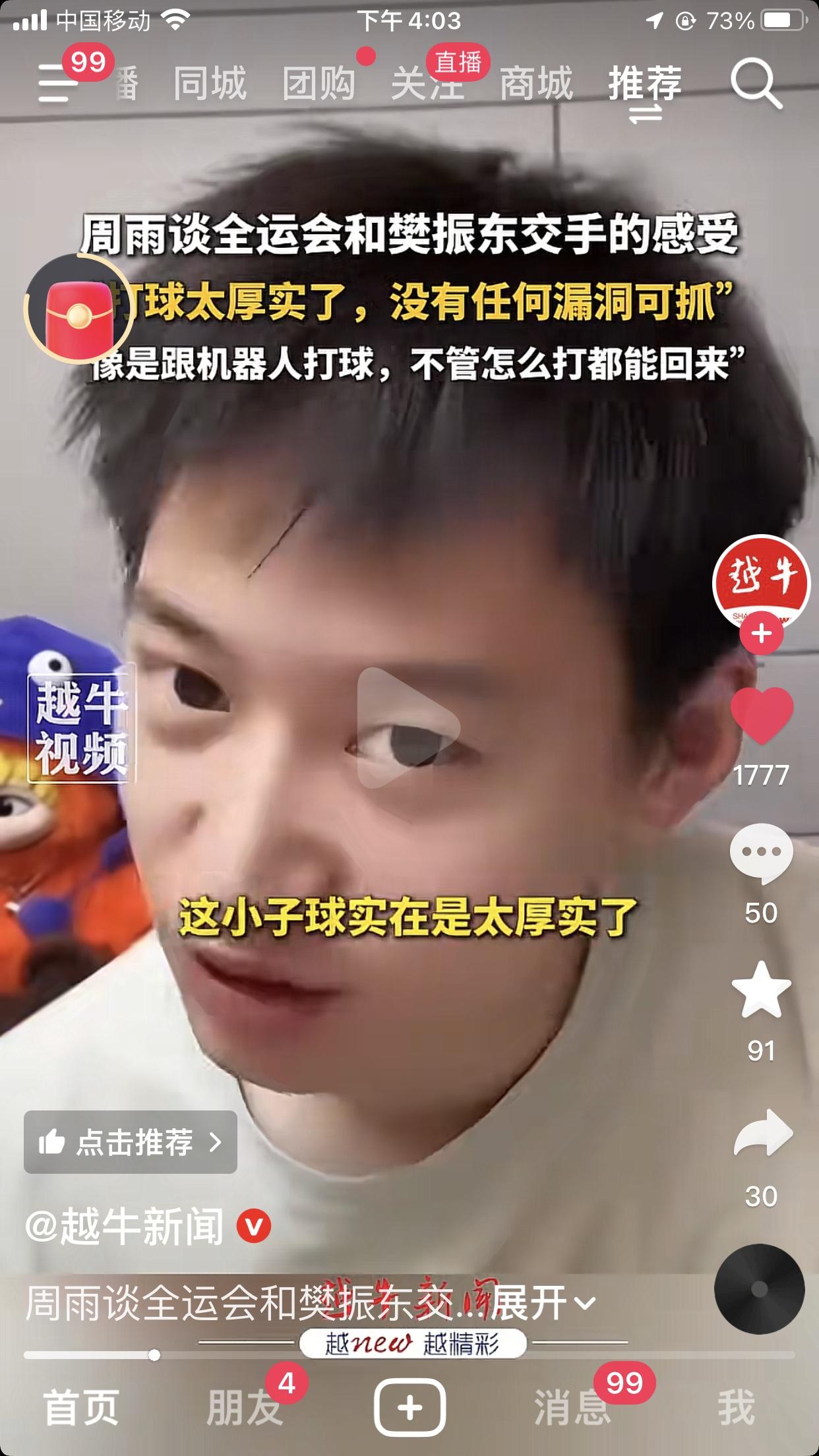 有人问周雨和樊振东打比赛是什么感受?周雨说:这小子打球实在是太厚实了。那么多的签,咋就让我抽到了呢!跟他在一起训练挺舒服的,跟他比赛是真难受。有点儿跟机器人打球一样,你怎么打,他都会给你打回来,他总是会比你多打一板。 我想说周雨,有的人和他打的机会都没有,全运会上你第一个打樊振东,下来可以傲娇的说全运会只输樊振东,知足吧。 其实周雨也是有实力的,13年17年樊振东搭档周雨男双卫冕冠军,19年世界军运会两人也是男双冠军。 周雨你虽然赢不了小胖,但是我们喜欢小胖的同时也喜欢你[捂脸]
