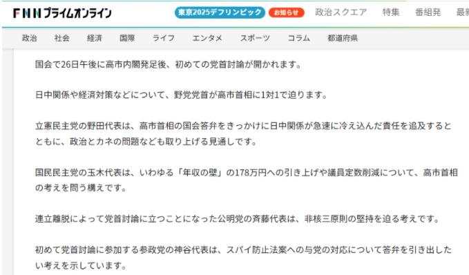 日本首相高市早苗今天下午或迎来“修罗场”,根据日本富士新闻网消息,今天(11月26日)下午,高市早苗将进行上任后的第一次党首讨论会。到时候,各大在野党党首将轮番对高市早苗进行严肃的政策质询,中日关系、修宪问题、经济问题都将会成为攻击高市早苗的话题。 最先跳出来发问的得是立宪民主党党首野田佳彦,他手里攥着高市早苗11月7日捅的大娄子,把“台湾有事”和日本“生死存亡”绑一块儿说的糊涂话。 这可不是小争议,日本前首相鸠山由纪夫都急了,搬来《论语》劝她“错了就得改”;还有1700个日本老百姓直接堵到首相官邸门口喊口号,要她收回这种“把日本拖进战争的危险话”。野田佳彦要的不只是一句解释,是真能修复中日关系的办法,毕竟现在连日本中国友好协会都发声明骂了,说这是粗暴干涉中国内政,把日中关系作到了谷底。 这边刚摆好架势,公明党党首齐藤铁夫的质问更戳心。公明党跟自民党合作了26年,算是老盟友,结果今年就因为高市早苗闹掰了,退出了执政联盟。现在枪口直接对准她的安全政策,核心就一条,必须明明白白承诺遵守“无核三原则”,不拥有、不制造、不运进核武器。 这事儿早不是党内吵架了,日本那些原子弹受害者团体都发声明强烈反对改这个国策,前首相岸田文雄也公开说要接着坚持。高市这届政府要是还含糊其辞,不光公明党这边没法交代,自民党在国会里的日子只会更难过。 老百姓最关心的经济账也被翻出来了。国民民主党党首玉木雄一郎盯着日本人的“钱袋子”不放,水产品卖不出去、旅游业没起色,这些老百姓的糟心事全成了质问的重点。高市上台后就知道在安保上放狠话,提振经济的实在招儿一个没有,现在被追问具体办法,想靠说空话混过去估计悬。毕竟经济好不好,渔民和做旅游的最清楚,拿不出解决办法,她的支持率只会接着掉。 参政党党首神谷宗币则把矛头对准了日本的国家安全立法,这其实也是高市早苗一个劲儿搞强军扩武的延伸。最近自民党刚启动安保战略修改,连俄罗斯外交部都忍不住骂了,说日本人过了80年还不承认二战的结果。神谷宗币问来问去,本质上就是想搞明白,高市嘴里说的“安全”,到底是保护日本老百姓,还是要走二战的老路。 其实高市早苗的麻烦早不止在日本国内。她那套涉台言论,连美国学者都看不下去,直说这是“特别危险”的挑衅,违背了一个中国原则;韩国、越南这些国家也跟着批评,说她这是在给军国主义穿马甲。现在四大在野党攥着这些国内外的争议找上门,每个问题都打在要害上。 说白了,这场“修罗场”的根子还是在高市早苗自己身上,是她把路走窄了。台湾问题是中国的内政,这是《日中联合声明》里写死的承诺,也是全世界都认的理;“无核三原则”是日本老百姓用血泪换来的国策;经济和民生更是当政的根本。 今天下午她要是还拿不出诚恳的态度和实在的办法,不光在野党不答应,日本国内的抗议声、国际社会的质疑声,只会越来越大。