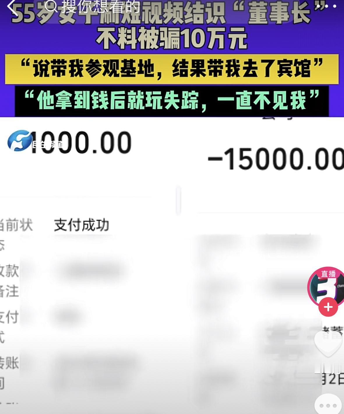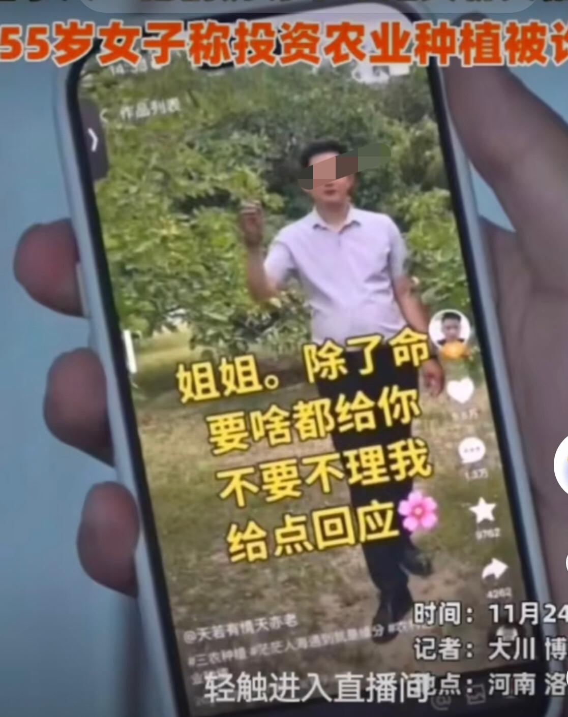 “董事长爱上快要绝经的我”! 这可不是电视剧里的画面,而是真实发生在河南洛阳一起真事。 今年55岁的张女士,平时没事喜欢刷短视频,一次无意中刷到了一位自称董事长的成功男士。视频里,男子衣着光鲜,一套衣服上万,一条皮带就几千,说话彬彬有礼自带磁性。闲聊时,董事长还向张女士暗示这几年一直没遇到真正喜欢自己的女人,大多数都是冲着自己的身价而来。说张女士温柔体贴,正适合自己的择偶标准。 张女士一开始也不敢相信这是真的!毕竟自己都55岁了,很快就到绝经年龄,怎么还有这么优质的男人喜欢呢?可转念一想,不去尝试一下这个“苹果醋”又怎知它是酸的呢,张女士豁出来了,决定来一场轰轰烈烈的黄昏恋,这正中了男子想要的结果!接下来就是向张女士说打算投资一个中药材种植基地,由张女士担任公司总经理助理,并约张女士一起去基地考察。 当张女士如期前来赴约时,才谁知道去的不是什么基地,而是宾馆。男子见水到渠成一番“翻云复雨”不失时机向张女士提出基地还差现金周转,先后向她借了10万,还让她打了9万的欠条。 (来源:民生频道) 钱到手后的几天,张女士还一直在做着“总经理助理”兼“董事长太太”的美梦。可当时张女士打电话给对方时,电话怎么都联系不上该男子,男子玩起了“失踪”!如梦初醒的她觉得大事不妙,于是报警,并向当地媒体求助,希望能追回自己被骗的钱。目前,警方已介入调查,能不能追回这笔钱还是个未知数。