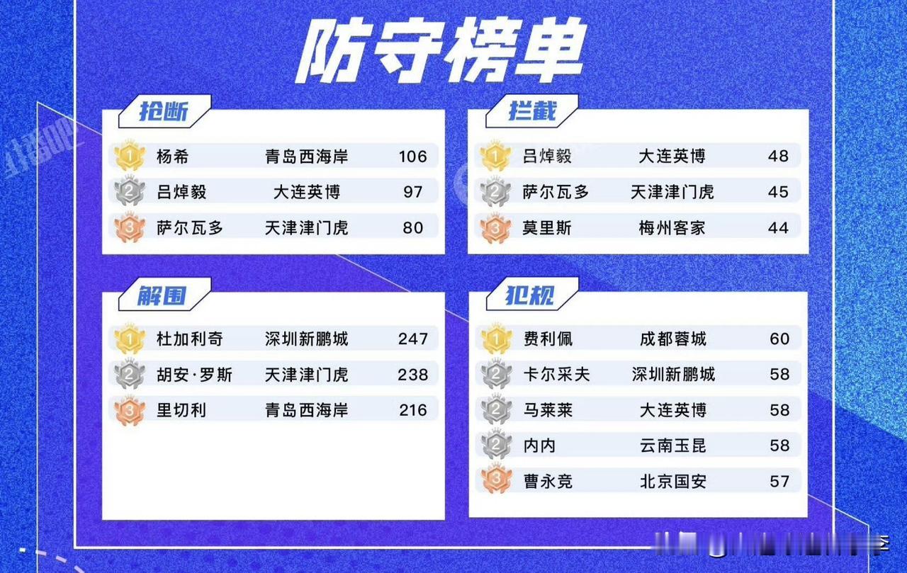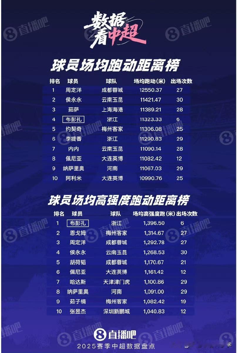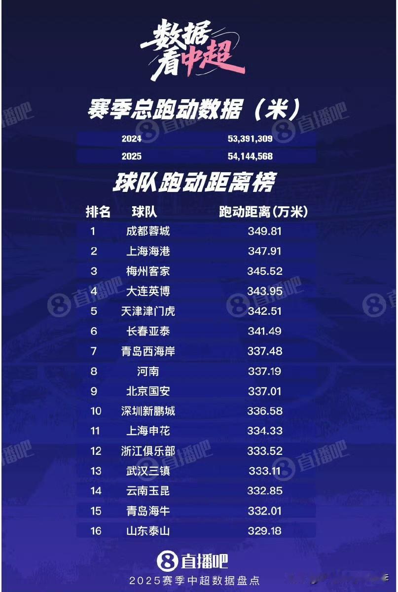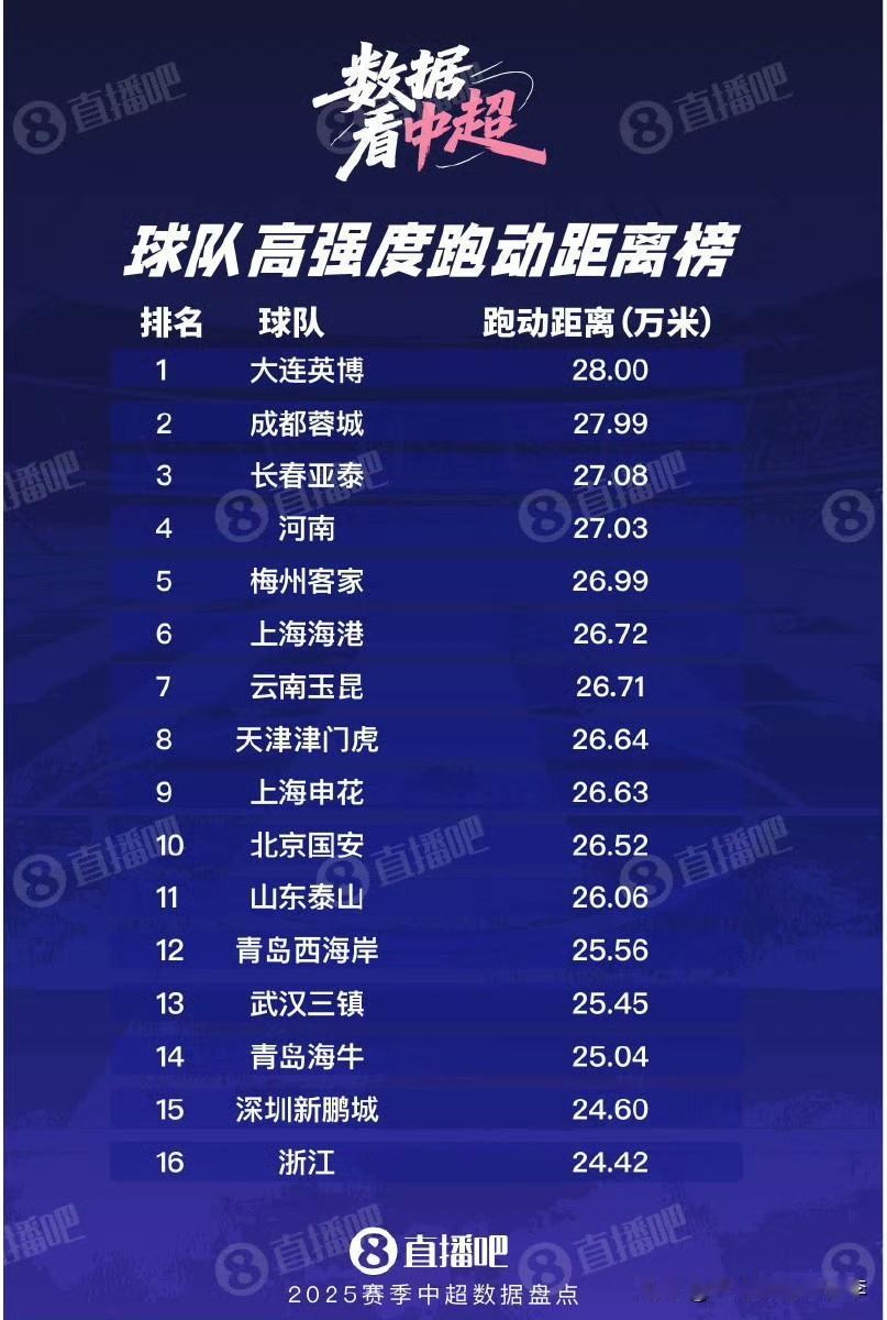 看看25赛季大连英博队的一些数据,26赛季得引进一个能进球的外援中锋了! 直播吧给出了今年中超联赛的一些数据。 ·射门转化率(图1):大连英博队以7.9%排在倒数第一,确实大连英博队把握机会能力太差了,马莱莱快乐足球其他外援也不能进球,国内球员在进攻方面的贡献也不大。下赛季想要保级并取得理想成绩的话必须引进一个能进球的外援,个人认为最好是中锋,像成都蓉城费内佩那样的中锋,如果马莱莱能走的话再引进一个边路有速度能突破的爆点外援那是最好了。 ·平均打入1球时间(图2):大连英博队平均打入1球需要103.7分钟,仅次于降级的亚泰排在倒数第二,103.7分钟就是说场均进不了一个球,排在第一的海港是43.75分钟,不到半场就能打入1球。 ·高强度跑道距离(图3):大连英博队以28万米排在第一,可见球员实力不足的英博队能够保级成功靠的就是球员们的拼劲。 ·球队跑动距离(图4):大连英博队排在第四,排在第一的是成都蓉城,韩国教练对跑动的要求还是很高的,我一直觉得跑动出战术,没有毛病,但排在第三的梅州客家却降级了,看来得好好总结一下了。 ·球员跑动距离榜(图5):场均跑动距离方面大连英博的佩尼亚和阿利米排在第8和第10,高强跑方面佩尼亚排在第6。值得一提的是云南玉昆的侯永永,他无论是场均跑动距离还是高强跑都排在前列,虽然没有去年在挪甲时候那样高光,但是能说明比赛态度很好。再就是周定洋,他是真好用! ·个人防守榜(图6):大连英博队的吕焯毅拦截第一,抢断第二,我想马里奥是时候入选国家队了! 中超