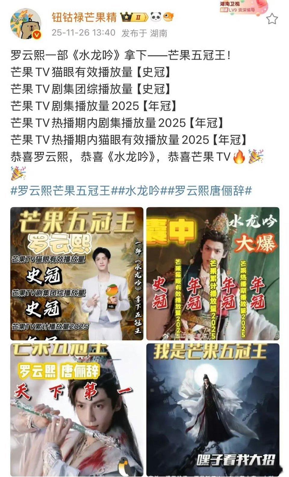 罗云熙水龙吟拿下芒果五连冠!!!2个史冠🏆,3个年冠🏆!