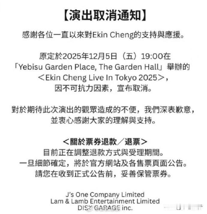 郑伊健东京演唱会突然取消,表面看是一场商业演出的意外,其实是地缘政治温度计的一次灵敏跳动。 新闻事实很简单:离12月5号开演只剩10天,主办方突然以“不可抗力”为由叫停了演出。大家注意这个时间点和背景,最近中日关系什么样,大家心里都有数。在演出行业,“不可抗力”是个筐,什么都能往里装,但在没有自然灾害的情况下突然刹车,极大概率是审批环节或者外部压力出现了“硬伤”。 这里面最惨的是那帮香港粉丝,机票酒店早就锁死了,现在退都没法退。这说明了一个残酷的逻辑:在国际关系趋紧的时候,民间文化交流往往是最先被献祭的牺牲品。你以为你只是去听首歌,其实你是在两个庞然大物的摩擦缝隙里求生存。郑伊健出场费