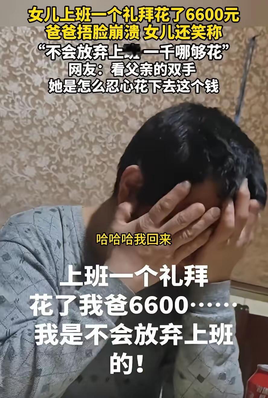 没有公主命却得了公主病!上海,一位女生上班一个礼拜辞职了,虽然自己只挣了1000块钱,却眼睛都不眨花了父亲6600块钱,当她向父亲炫耀自己1000元根本不够花时,父亲捂着脸崩溃痛哭。 一位上海女生,找了份工作只上了一个礼拜就辞职了。这一周里,她自己只挣了1000块钱,可花起钱来却一点不含糊,眼睛都不眨就花掉了父亲6600块。 更让人唏嘘的是,她还拿着自己的消费账单跟父亲“炫耀”,觉得1000块钱根本不够花,言外之意就是以后还得靠家里补贴。结果这话刚说完,父亲就再也忍不住了,双手捂着脸,哭得几乎直不起腰,那股子委屈和心酸,隔着屏幕都能感受到。 咱们普通人都知道,上班不容易,刚入职更是得稳扎稳打,就算不适应想辞职,也得好好规划,哪能这么任性说走就走?可这姑娘倒好,一周就撂挑子,完全没考虑过赚钱的辛苦。更让人难以理解的是她的消费观,自己只挣了1000,花出去的却是好几倍的钱,而且这些钱压根不是什么生活刚需,全花在了漂亮衣服、新款包包这些享乐的东西上。 再看看这位父亲,一看就是常年为生活奔波的人。视频里镜头扫过他的手,那双手上爬满了大大小小的旧伤痕,指节粗大,皮肤粗糙得不像样,一看就是长年累月干重活、在生活里硬扛才留下的印记。就连他拿起杯子喝水的时候,手指都在微微发颤,看得出来身体已经有些吃不消了。可就是这样一位父亲,平时自己舍不得吃舍不得穿,对女儿却从来都很大方。 当初女儿说要上班,他还满心欢喜,觉得孩子长大了能独立了,所以当女儿伸手要钱的时候,他想都没想就给了,甚至还天真地以为,这些钱是女儿刚入职场需要打点人情、置办行头的“刚需”,是为了在社会上立足的必要开销。 他怎么也没想到,自己勒紧裤腰带省下来的血汗钱,根本没用到正地方,全变成了女儿身上可有可无的装饰品。这种巨大的心理落差,加上长期以来的辛苦积压,才让他在听到女儿轻描淡写说“1000块不够花”的时候,彻底崩溃了。 更让人心里不是滋味的是女儿的态度。当父亲哭得撕心裂肺的时候,她不仅没有丝毫愧疚,反而还觉得有点好笑,甚至拿着手机在旁边记录。在她看来,父亲的眼泪似乎只是一场没必要的“苦情戏”,她压根没意识到,自己花的每一分钱,都是父亲用那双布满伤痕的手,一点点挣来的。 上班一周就辞职,她不仅不慌张,甚至还曾用请假当幌子骗家里,直到谎言被拆穿,也还是一副“这有什么大不了”的神情。那种理所当然的索取感,真的让人难以接受。 网上不少网友看了这事儿,都忍不住感慨。 有人说,同样是面对父母的辛苦,有的孩子哪怕考上研究生,因为不忍心让父母继续操劳,都主动放弃了深造的机会;可有的孩子,却把父母当成了取之不尽的提款机,只知道一味索取,完全不顾及父母的难处。人和人的差别,怎么就这么大呢? 其实这位父亲哭的,从来都不是那6600块钱。 钱没了可以再挣,可那颗毫无保留爱着女儿的心,被女儿这么轻飘飘地践踏,才是最让他绝望的。他哭的是自己拼尽全力托举女儿,想让她过得好一点,可在女儿眼里,这份爱竟然这么廉价,连一秒钟的感恩都换不来;哭的是自己那双哪怕受伤也要坚持干活的手,最终换来的只是女儿的一句“不够花”和无所谓的态度。 年轻人刚入职场,迷茫、不适应、觉得累了想歇歇,这都能理解,也不是什么大错。可错就错在,不能把父母的付出当成理所当然,更不能拿着父母的血汗钱肆意挥霍。那些昂贵的包包和衣服,或许能让她在朋友圈里赚点眼球,但却遮不住内心的匮乏,也永远换不回父亲那双布满伤痕的手递过来的滚烫真心。 真正的长大,从来都不是能挣多少钱,而是能看懂父母的辛苦,能体谅他们的不易。希望这位姑娘能早点醒悟过来,明白自己今天所谓的“不够花”,背后是父亲多少个日夜的操劳。也希望所有年轻人都能记住,父母的爱从来都不是无限透支的,只有懂得珍惜和感恩,才能不辜负这份沉甸甸的父爱母爱。 信息来源:抖音——巨星小熊猫