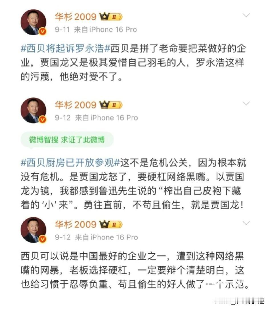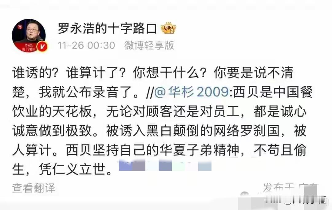 这一次,罗永浩不再忍了。 两个月前,华衫认为罗永浩在西贝事件中是网络黑嘴,最后以私下给罗永浩道歉而告终。 两个月后,华衫又发声称西贝被人算计了,遭到罗永浩质问被谁算计了?之后罗永浩又发文,要求华衫公开道歉,否则华与华将消失,而且仅给出半天的时间,火药味都快溢出屏幕。 客观地说,罗永浩在西贝事件中。不过是一个普通消费者的吐槽,贾老板如果情商高,说不定能成为西贝一个好的宣传机会,可他选择了要给西贝讨一个说法,更要命的是,曾经服务西贝的华与华老板还在一旁拱火,最后不排除被人带节奏,西贝客流量一落千丈,但西贝自身有漏洞才是整件事的关键。 现在华衫又出来为西贝正名,怎么好像不是来帮西贝的,而是想引火上身,自己和自己过不去呀。 还有一个多小时,不知华衫会不会又道歉呢?