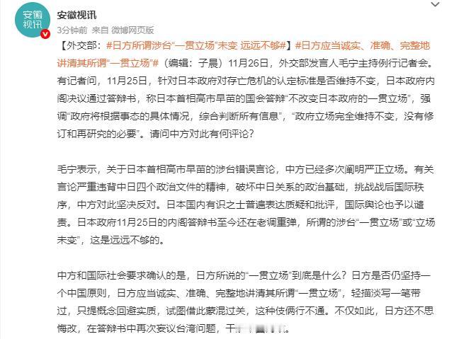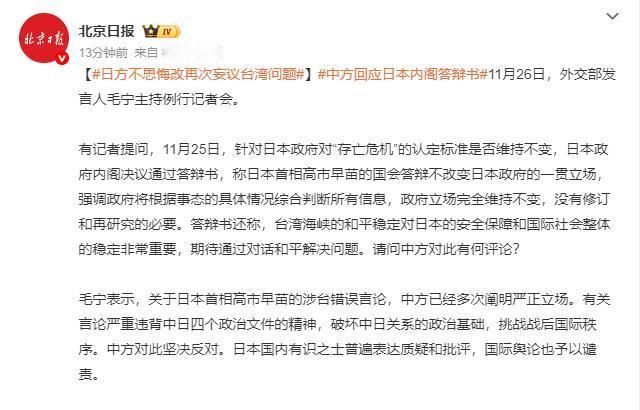 11月26日,日方传来消息,日本政府近日展开多线行动,为高市早苗的错误言论狡辩! 11月25日,特朗普和高市通话之后,很多人还以为高市应该能够承认自己的错误,可是高市不仅没有这方面的任何回应,现在日本政府又为高市的错误言论再狡辩,也就是日本政府的立场完全维持不变,看来他们依然是没有任何悔改,特朗普也没有起到任何作用。 截止到目前为止,各方也都尽力了,该说的也都说了,可是日本根本听不进去。就连日本前首相石破茂都称高市是不能光过一下嘴瘾,可以说石破茂是最了解高市的一个人了,大家也知道石破茂是一位很实在的人,不弄虚作假,是一就是一。从之前的活动就能看出,他困了就在会议上睡觉,饿了就在会议上吃东西,根本不在乎别人的眼光。所以高市其实也没有什么本事,就是为了能当稳自己的首相,才说出这样的话。