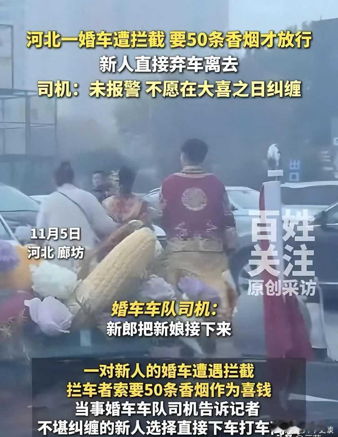 河北新人遭50条烟拦车后续:新娘痛哭离场,更糟的还在后面 谁能懂?一辈子一次的婚礼,竟被一群“拦路抢喜”的人搅得稀碎!河北廊坊这对新人的遭遇,看完真的气到发抖——大喜之日被硬要50条烟,新娘哭着离场,后续发展更让人揪心。 事情发生在11月5号上午,新郎满心欢喜去接新娘,婚车队刚要出发,就被两辆白车死死拦住。车上下来十几名30到50岁的壮汉,张口就狮子大开口:“想过这儿,必须拿50条烟来!” 新人一开始以为是当地讨喜习俗,笑着说没准备这么多,愿意给喜糖和小红包。可这群人根本不买账,还甩了“二选一”:要么50条普通烟(市价约6000块),要么10条高档烟,少一条都别想走。 这哪是讨喜,分明是光天化日的敲诈!双方僵持了一个多小时,吉时越拖越近,新人实在耗不起,只能忍痛弃车。视频里,新娘频频回头望着婚车,满是不舍,回到家后直接哭红了眼——一辈子就一次的婚礼,连婚车都没坐上,这份遗憾怎么也抹不去。 更让人窝火的是,新郎早就特意租了外地车牌的婚车,就怕遇到本地拦车索财的,没想到还是没躲过。 本以为事情曝光后能讨个说法,结果更糟的来了:婚车司机把现场视频发到网上,热度刚起来,原视频就神秘消失,发布者只无奈说了句“被制裁了”。 更离谱的是当地街道办的回应,接线员居然说“拦婚车在这儿挺常见,没人拦反而不好,显得没人气”。这话一出,网友直接炸了:正常讨喜给点喜糖红包没人反对,但借着习俗敲诈勒索,还被基层部门默许,这不是纵容陋习吗? 律师早就明确说了,这种拦车索财的行为,已经涉嫌敲诈勒索或寻衅滋事。他们就是吃准了新人“大喜之日不想闹事”的心理,才敢这么嚣张。而且这事儿还影响了婚车费用结算,婚庆要等婚礼结束才对接车队,现在这笔钱还没谈拢。 好好的喜事变成闹心事,新娘的眼泪、曝光者的无奈、基层部门的不当回应,每一点都让人寒心。真心希望这种借着“婚俗”名头的敲诈行为能被彻底整治,别再让新人的幸福被糟蹋。 也提醒各位新人,遇到这种事别一味妥协,先保留好视频、录音等证据,该报警就报警,别让自己的喜事变成别人敛财的工具。你们觉得这种“拦婚车索财”该怎么整治才管用?欢迎在评论区聊聊你的看法。