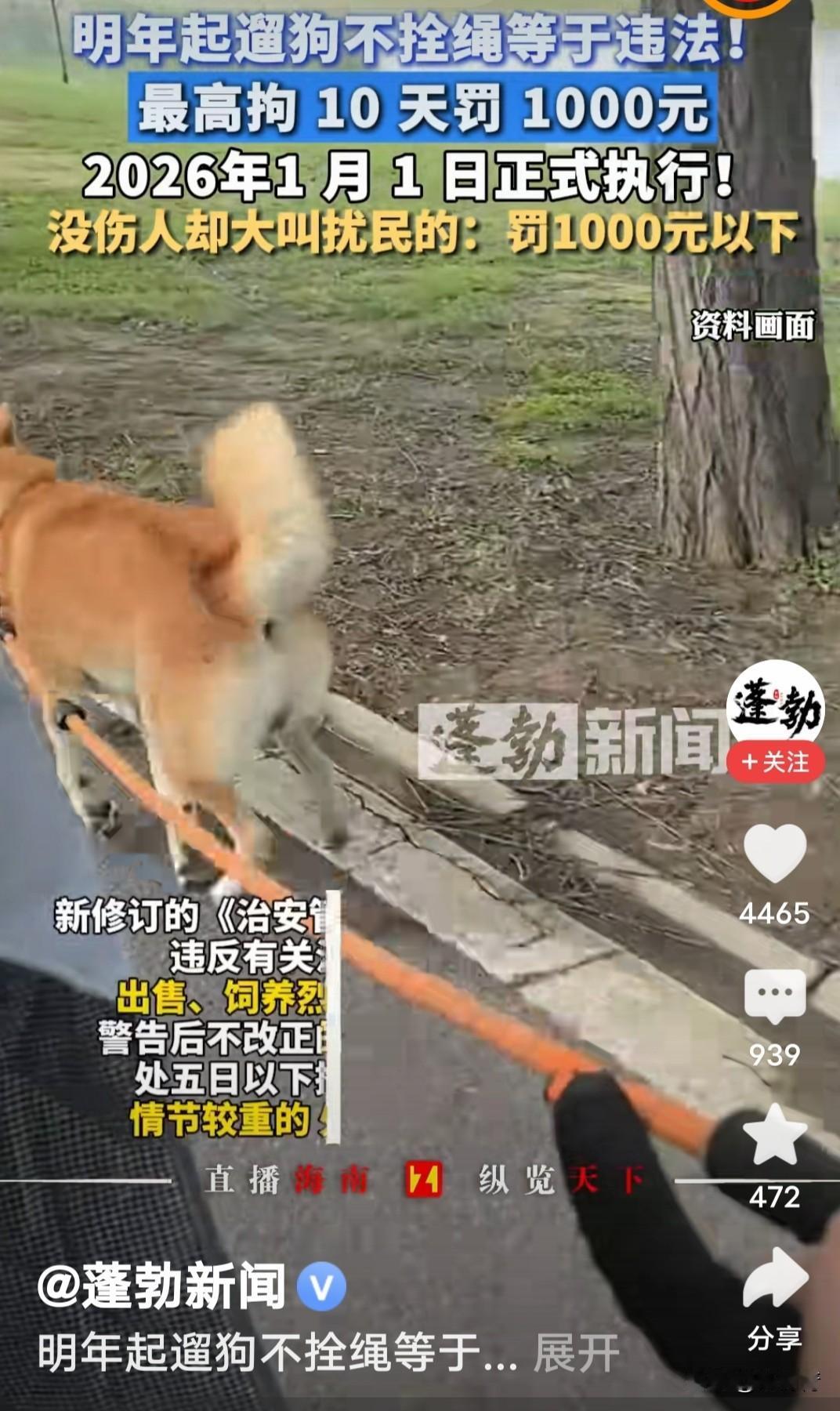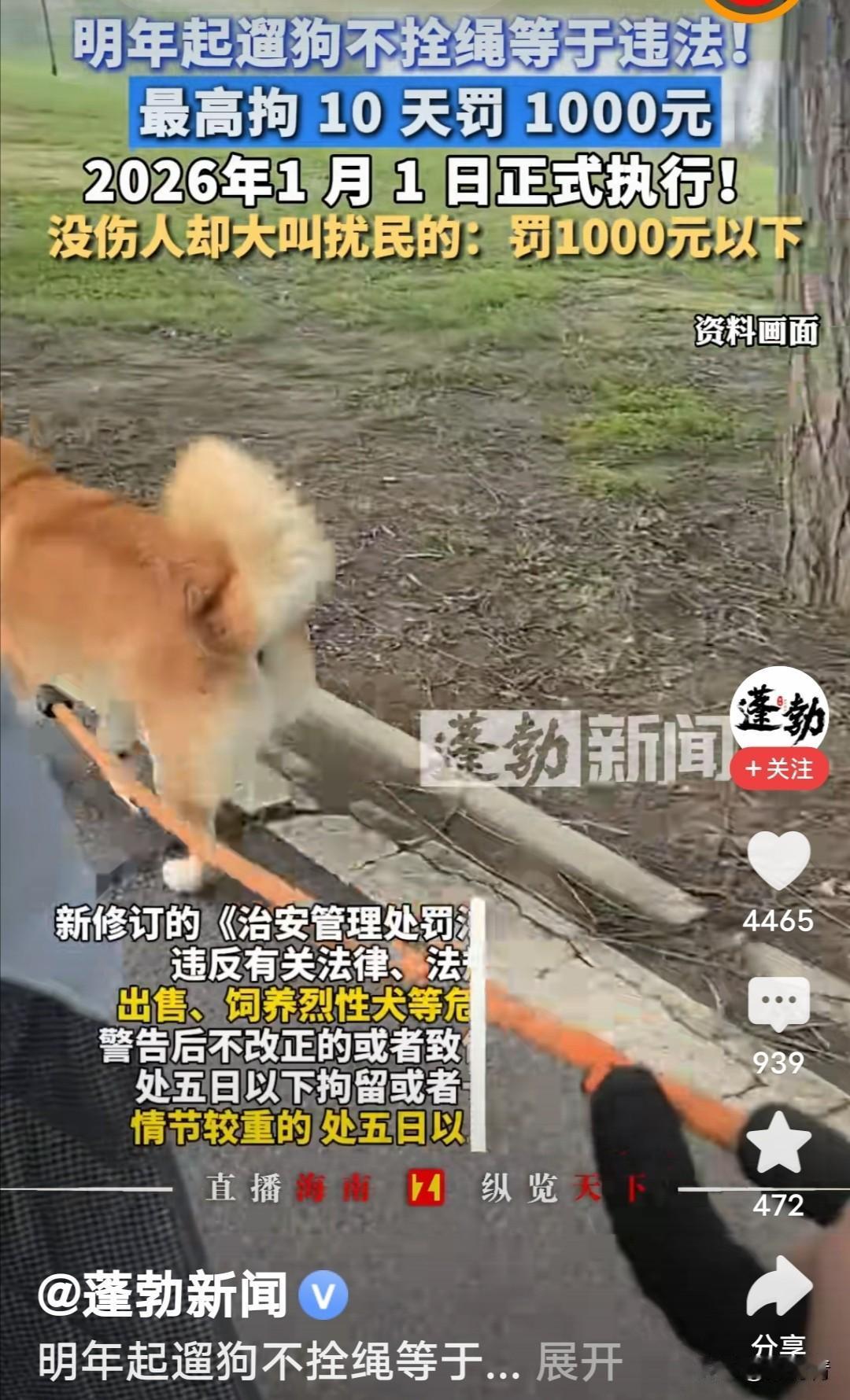 养狗不拴绳违法!公说公有理,婆说婆有理。别再争吵了,这下板上钉钉;养狗不拴绳最高拘留10天,罚款1千元。明年1月1日开始执行。 有人总爱抬杠,爱护动物,狗狗也有生存权利。这与遛狗拴绳两码事,狗拴绳能预防它伤害到别人,便于控制管理。 网友评论,“那些虐待伤害小动物的是不是也应该立法处理?那些吃猫狗,虐杀的怎么办?” “现在养狗、养猫的人太多,电梯属于封闭空间,不适合搭载狗猫,也应该立法不准动物乘电梯。” “遛狗不牵绳罚款、拘留!早就应该立法了,非常赞成。希望落实好,不能雷声,大雨点稀。”