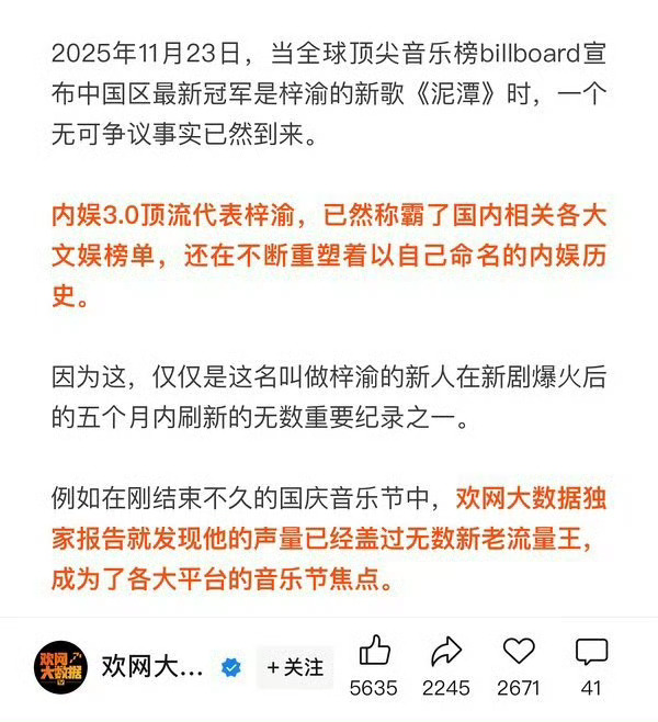 梓渝内娱3.0顶流 梓渝被欢网认证为3.0顶流代表,称霸国内各大文娱榜单,重塑内娱历史。