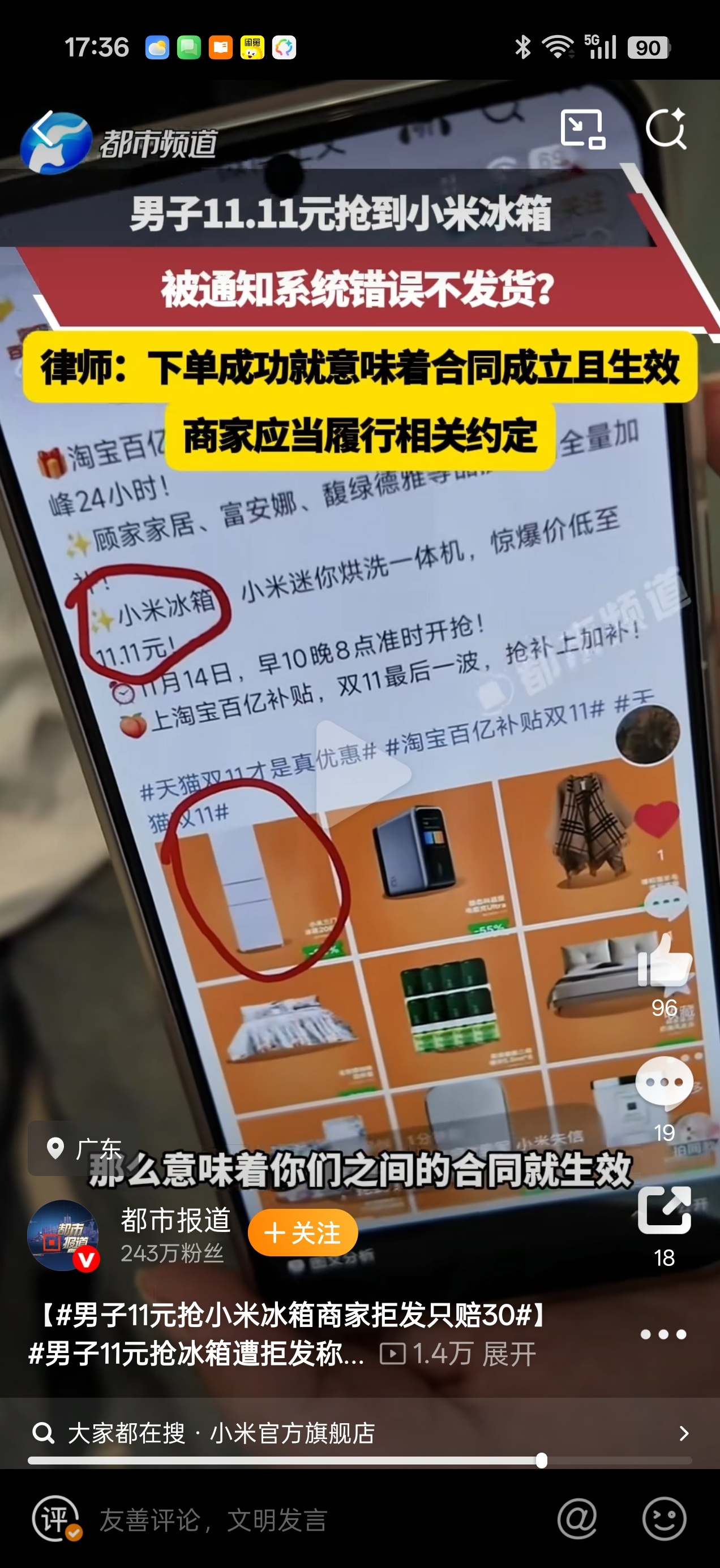 是在小米官网抢的吗?另外就是有没有用脚本男子11元抢小米冰箱商家拒发只赔30