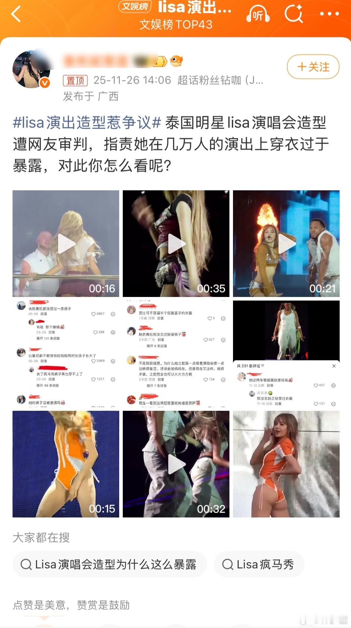 lisa演出造型惹争议在穿着方面,她真的不是什么好榜样。本来韩国女团风气转好,女爱豆基本都穿安全裤出演,女爱豆布料很少,有安全裤表演起来多少好一点。结果,自从lisa老是露屁股蛋子,韩国那些公司也有开始跟风的迹象,让女爱豆穿很短的短裤,还没有安全裤,然后也看着露着屁股蛋子的样子。在她的带领下,又开始倒退了,不露屁股难受,真是服了。她的粉丝会说,欧美人穿就没人说。哦,关键是欧美diva身材健美,露出来也没有风尘味,表情也不媚,而亚洲女性的体型小,还流行白幼瘦,缺少健美感,韩国艺人的表情又一股讨好感,再露出屁股蛋子,看着就非常不像话,像逛窑子。不露屁股,也一样能唱歌跳舞,好吧?