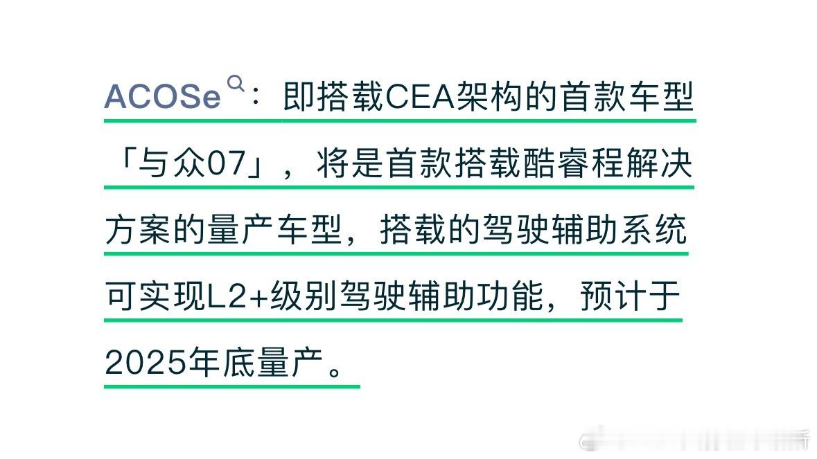 大众安徽第二款车,与众07今年底量产,搭载酷睿程的L2+辅助驾驶方案。新能源汽车