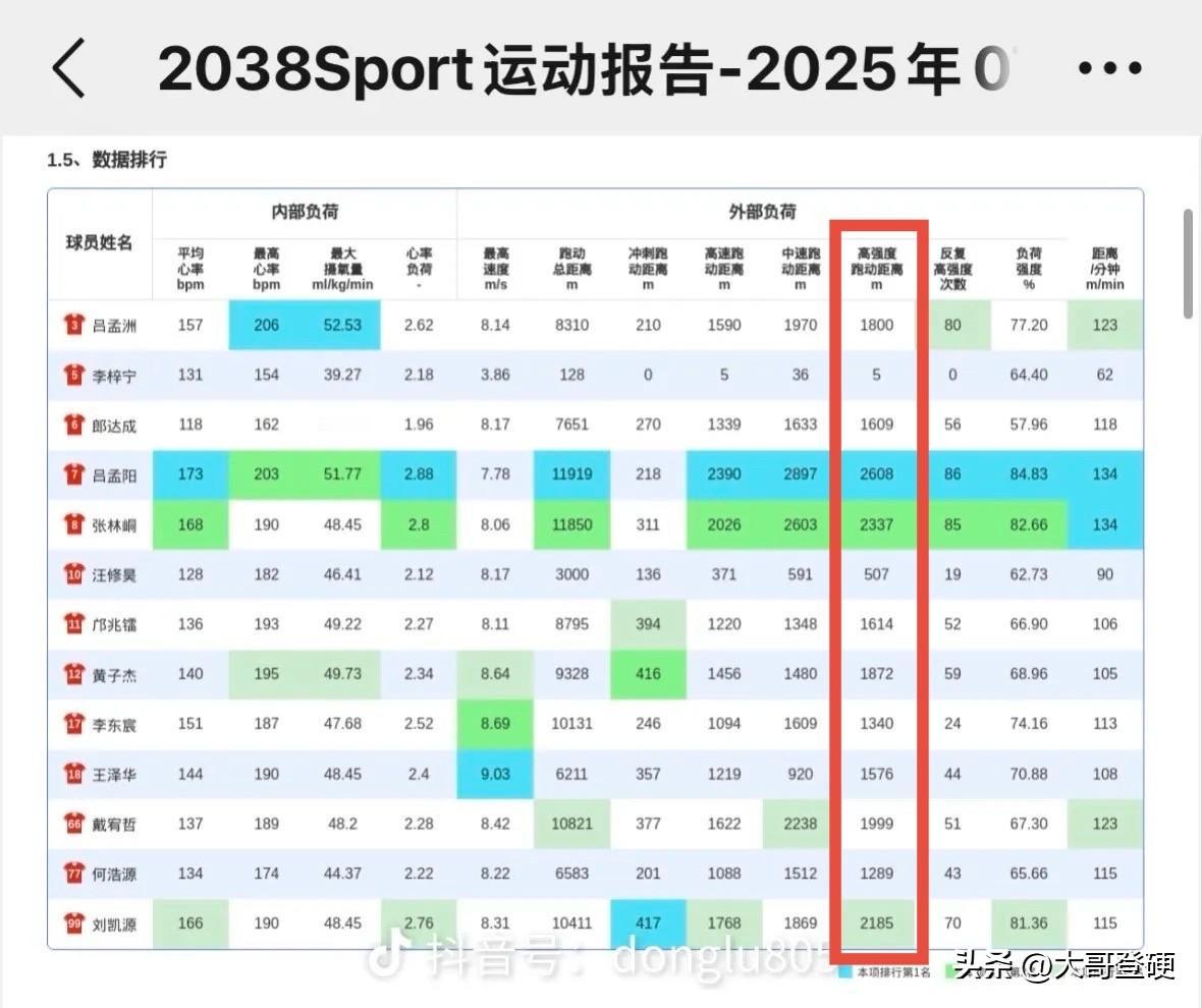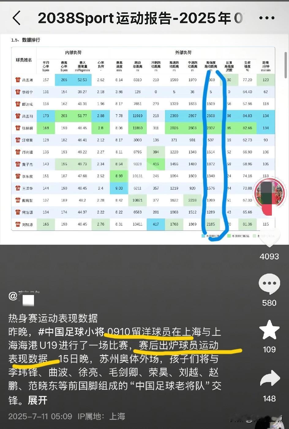 这是真的吗?!董路的09、10足球小将,高强度跑动数据,吊打2025赛季中超球员场均高强度跑动距离榜[打call] 北京时间11月26日,随着2025赛季中超联赛落下帷幕,中超球员赛季各项数据统计也悉数出炉[加油] 引人关注的是!中超球员场均高强度跑动距离榜上,在前10名球员当中,已故的浙江队外援布彭扎以场均1396.50米,位列榜首,而深圳新鹏城队的张昱杰以1040.83米,位列第10位,前十位球员可以说都是中超联赛公认的、出了名的“跑不死”[赞] 但今年7月董路发布的09、10足球小将,与上海海港U19队的一场热身赛的运动数据显示,09、10足球小将当中,3名球员单场高强度跑动距离超过2000米,5名球员单场高强度跑动距离超过1500米[恐惧] 如果按照这个数据来测算,中超场均高强度跑动距离榜第一的球员,在董路的09、10的足球小将里都排不进前八名,只能位居第九名[泪奔] 客观而言,参照【图四】本赛季北京国安队VS上海申花队的单场数据,中超联赛官方公布的各项数据,应该是准确的。但董路公布的这个数据,貌似可能存在水分吧?![what] 如果09、10足球小将,能在15、6岁拿出这样的高强度跑动距离,吊打中超现役“跑不死”球员,那这些小球员不得被各支中超球队疯抢了啊?[666]