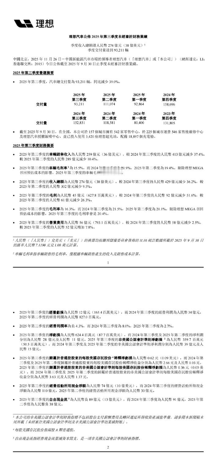 理想第三季度财报不好看是可以预期的,主要叠加了 MEGA 召回的损失。对此我只关心两件事,一个是第四季度,一个是 MEGA 召回到底成本价多少。我刚让 Ai算了下【2025年第三季度车辆销售收入为259亿元人民币,实际车辆毛利率为15.5%。剔除MEGA召回预估成本的影响后,车辆毛利率为19.8%。毛利率差值:19.8% - 15.5% = 4.3%,召回成本 ≈ 4.3% × 259亿元 ≈ 11.14亿元人民币。这一成本主要用于免费更换冷却液系统、动力电池等核心部件,涉及召回车辆约11,411辆(基于公开信息),平均每辆车成本约9.8万元人民币。】不知道对不对,你们算算呢?作为理想股东,我表示很淡定,这几个月买了汽车股,哪怕没有理想也不会太好过。还是来按摩一下吧。我们觉得它表现不好, 只是对它期待太高。对比去年的如日中天,今天这个成绩当然不好 ,但想想前些年理想也是从一年亏几十个亿过来的。当你感觉理想是不是不行的时候,打开榜单一看,现在前三季度的总销量其实还可以,营收在新势力里面也算是保持领先的。作为对比,小鹏、蔚来和零跑是今年新势力里面表现亮眼的企业吧,他们的营收也就 203.8、217.9 和 194.5 亿。不少车企销量猛涨短期股价起飞,最后也只是昙花一现,终究打不过特老头自己画 K 线。所以比起短期的颓废和沉迷,我更关心的是理想的长期发展和未来预期。比如理想 i8、理想 i6 两款纯电 SUV 销量其实已经超预期,尤其 i6今年产能早就卖光了(说 i8 和 i6 订单超过 10 万辆),那第四季度的销量应该很好看,考虑到明年的增程大换代,理想还真是可能实现纯电&增程两条腿。再叠加 VLA 的强势表现,以及最近准备发布智能眼镜等等新动作,理想正在从一家单纯的汽车公司,向「Ai和机器人企业转身」,这才是真正能将企业市值提高几个等级的方向。更重要的是,所有人都在预期明年竞争最残酷的时候,现金储备依然接近千亿规模的理想,绝对是新势力里面血最厚最抗揍的那一个。你们觉得呢?