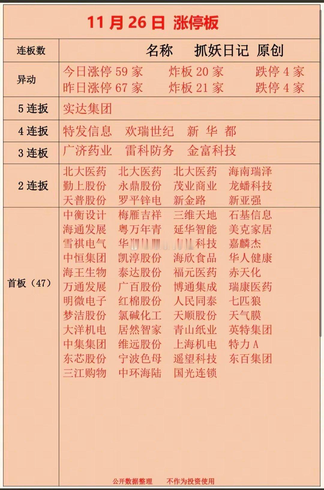 11.26周三 涨停板股票:梯队+高度!今日涨停59家 炸板20家 跌停4家昨日涨停67家 炸板21家 跌停4家5连板 实达集团4连板 特发信息 欢瑞世纪 新华都3连板 广济药业 雷科防务 金富科技