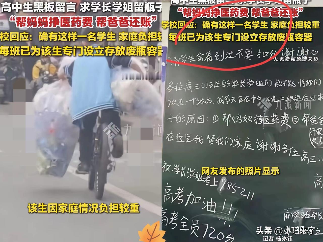 看哭了!高二男生因家庭负债在学校黑板上留言:请学长学姐把喝完水的瓶子留给我,我想帮妈妈挣医药费,帮爸爸还债! “学生会看到别扣分”,先小心翼翼护着班级荣誉,再怯生生问能不能把空瓶子留给他! 十几岁的年纪,本该是揣着零花钱买零食、和同学疯跑打闹的时光,他却悄悄扛起了家庭的重担! 没有哭哭啼啼抱怨命运,没有伸手向谁乞讨,只想着用最朴素的方式,为父母分一点压力! 最戳心的是老师和同学们的反应,每个班级都默默摆上纸箱水桶,悄悄为他攒着瓶子! 这份不声不响的温柔,比任何轰轰烈烈的帮助都更让人破防! 其实苦难从不可贵,可贵的是在绝境里依然揣着善良、扛着担当,不卑不亢往前走的模样。 这个男生身上的光,比任何满分试卷都更耀眼!祝福男生的妈妈早日康复!