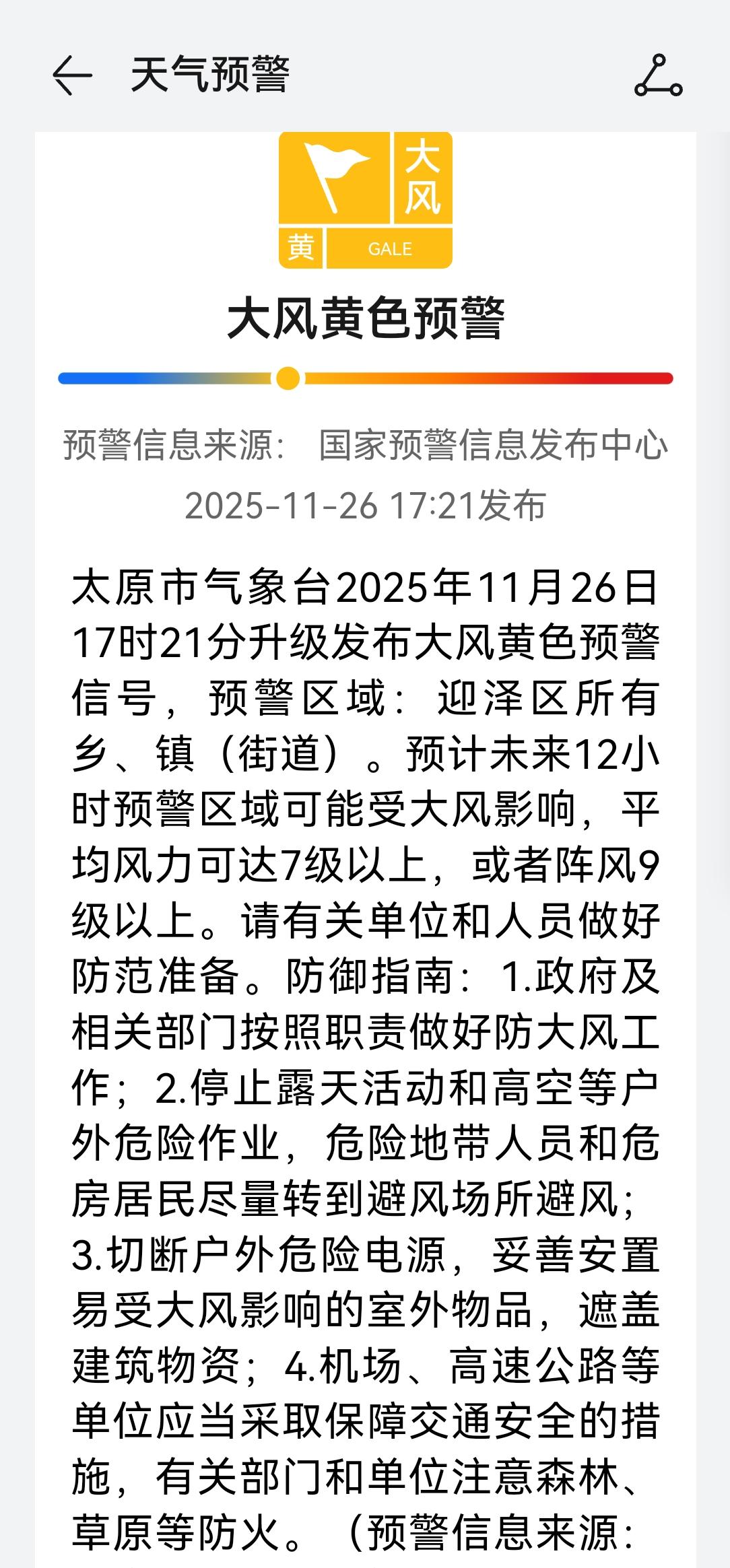 刚刚,太原市气象台发布了大风黄色预警,迎泽区是重点区域,现在户外的风力达到了5级,请市民朋友下班、下学路上要按照预警提示,做好防风保暖,注意交通安全。