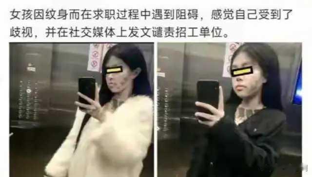 一女孩因身上有纹身,多次找工作被拒。 她发文吐槽公司侮辱人格,有刺青就一定是坏人吗? 纹身女孩不一定是坏人,但好女孩绝对不会去纹身。何况你连脖子,脸上都纹身呢? 每个企业都有他的文化观和社会观,每个公司都会注重自己员工的素质和形象。 有不少企业和公司确实存在拒聘纹身者入职。这并不代表他们侮辱你的人格,而是你不合适他们的要求。 一张脸都纹得花里胡哨的,谁见了第一心眼都会拒绝。