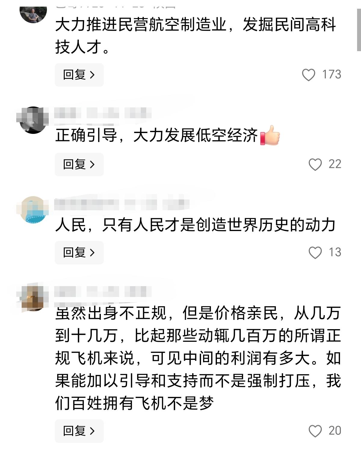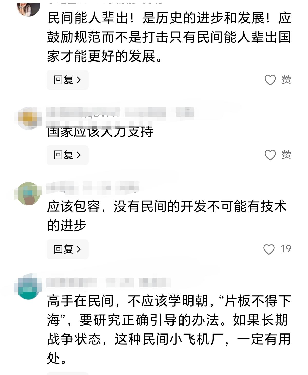面条厂造出飞机充分说明了我们的工业制造能力才是清场式遥遥领先。 也从侧面反映了中国人民聪明勤奋,善于开拓,精于创新,敢想敢干,敢打敢拼。 这如果加以技术引导和政策支持, 那分分钟冲出亚洲走向世界。 我们虽然离顶尖科技还有一定距离, 但是不影响我们将别人的顶尖科技发扬光大。 在我们高精尖还没达到世界领先时, 我们主打的就是借鸡生蛋, 就是走别人的路,让别人无路可走。 PS:这事件最可喜的是当主流媒体还以几十年前的态度去报道批评此事的时候,网友们的观点却出奇一致,要么慨叹高手出自民间,要么认为应当给予正确引导。