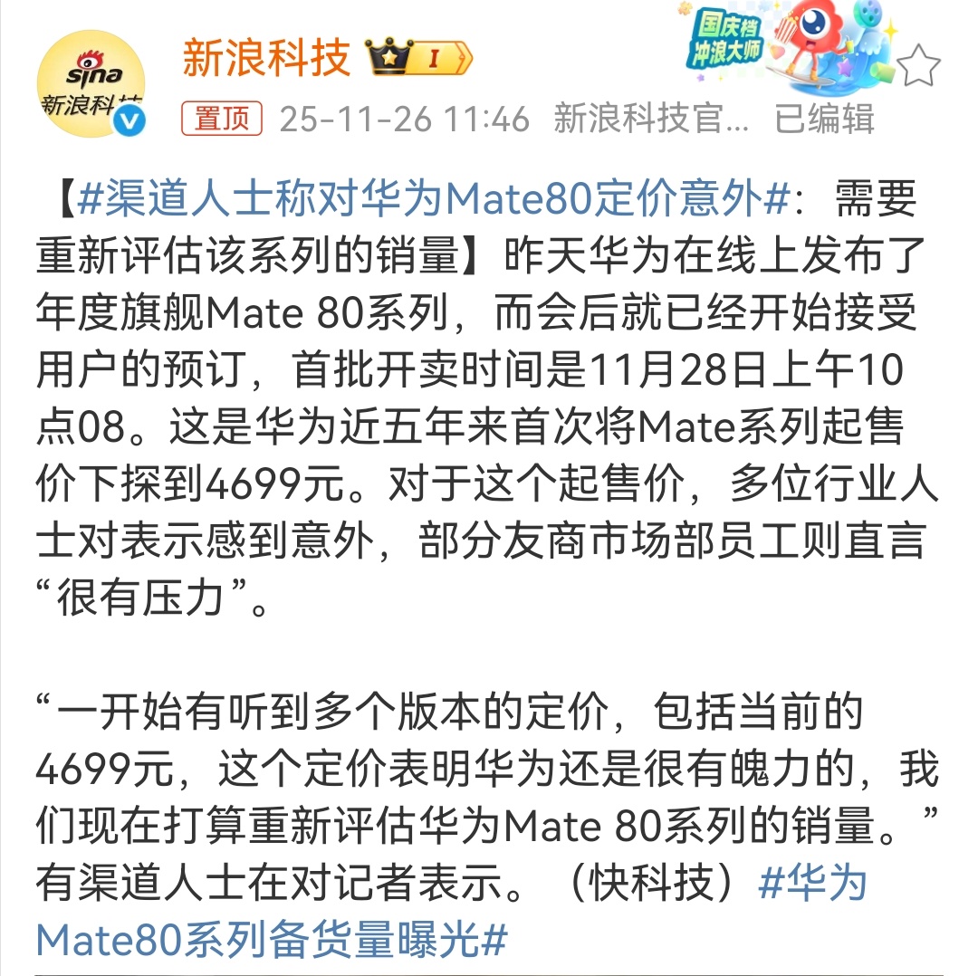 渠道人士称对华为mate80定价意外昨天这个定价很多人都很意外吧。4699起的价格,放发布之前真不敢想。