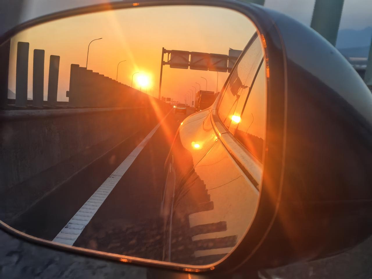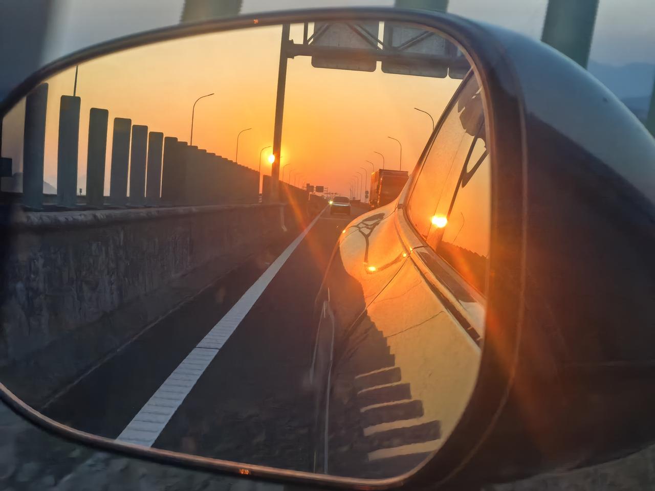 人在旅途, 11月20日下午开车从雁荡山到普陀山的路上,在后视镜里看到了美丽的夕阳,双手持手机机找到了好的角度,拍下这张照片。 你问我为啥能从容的用双手拍照?那是因为我开着鸿蒙智行智界r7,开着辅助智能驾驶,双手和眼睛都解放了出来。如果是以前的油车,那是万万不可能的。