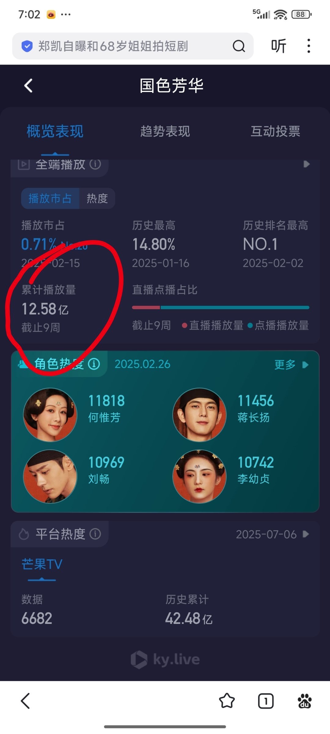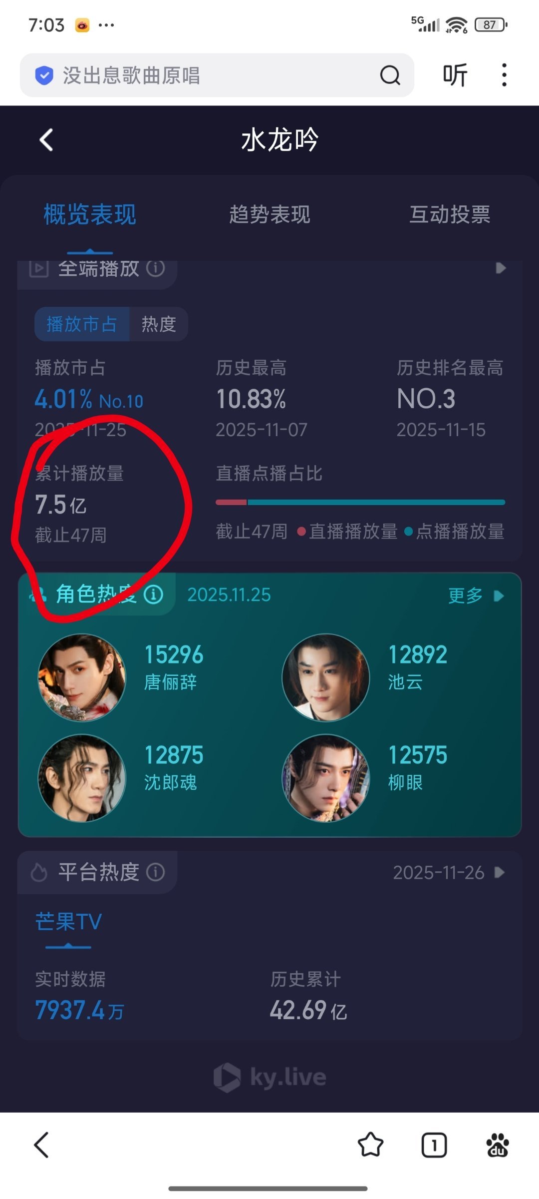 看了一下酷云数据——❶杨紫,李现主演的《国色芳华》 ,播放累计12.58亿。❷罗云熙,方逸伦主演的《水龙吟》,播放累计7.5亿。