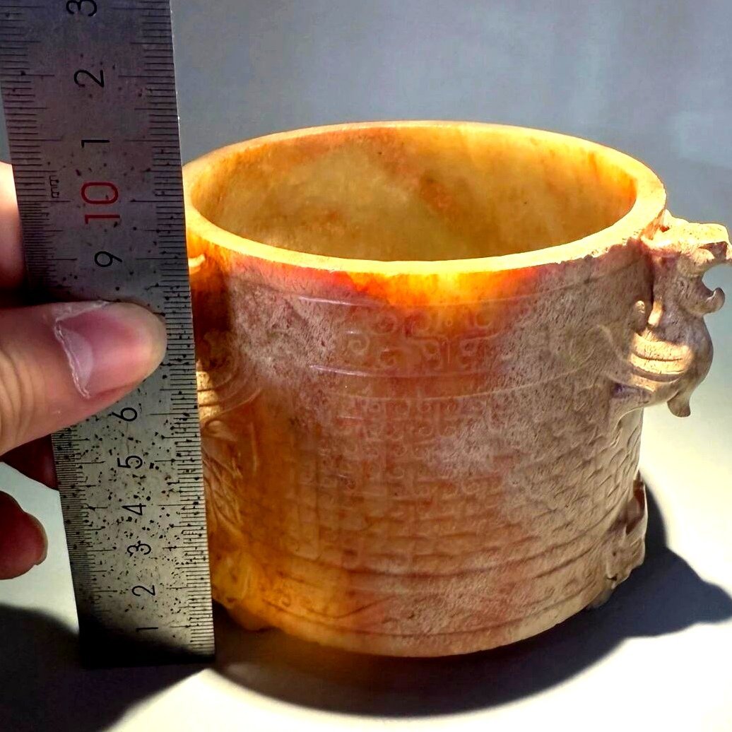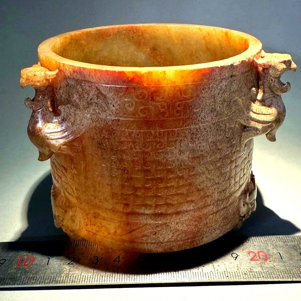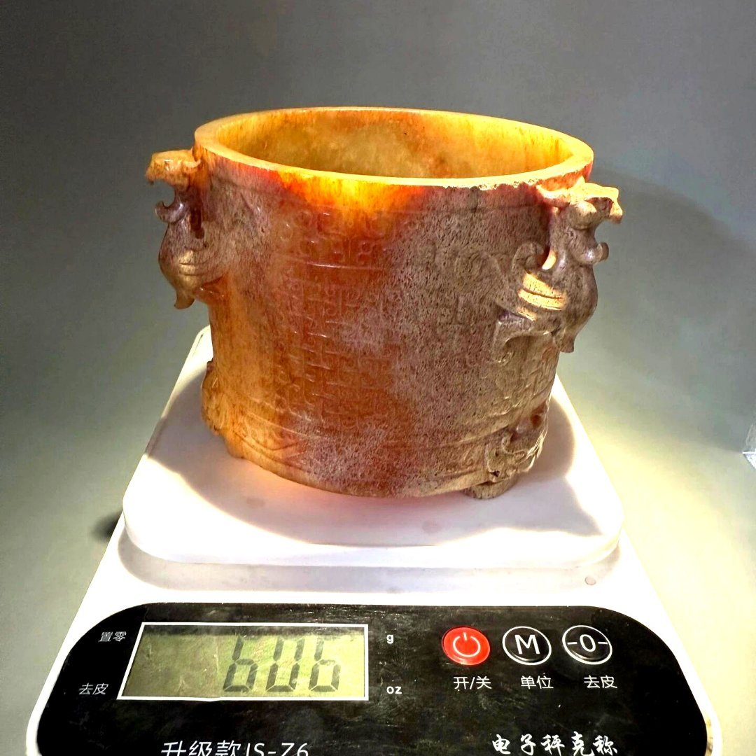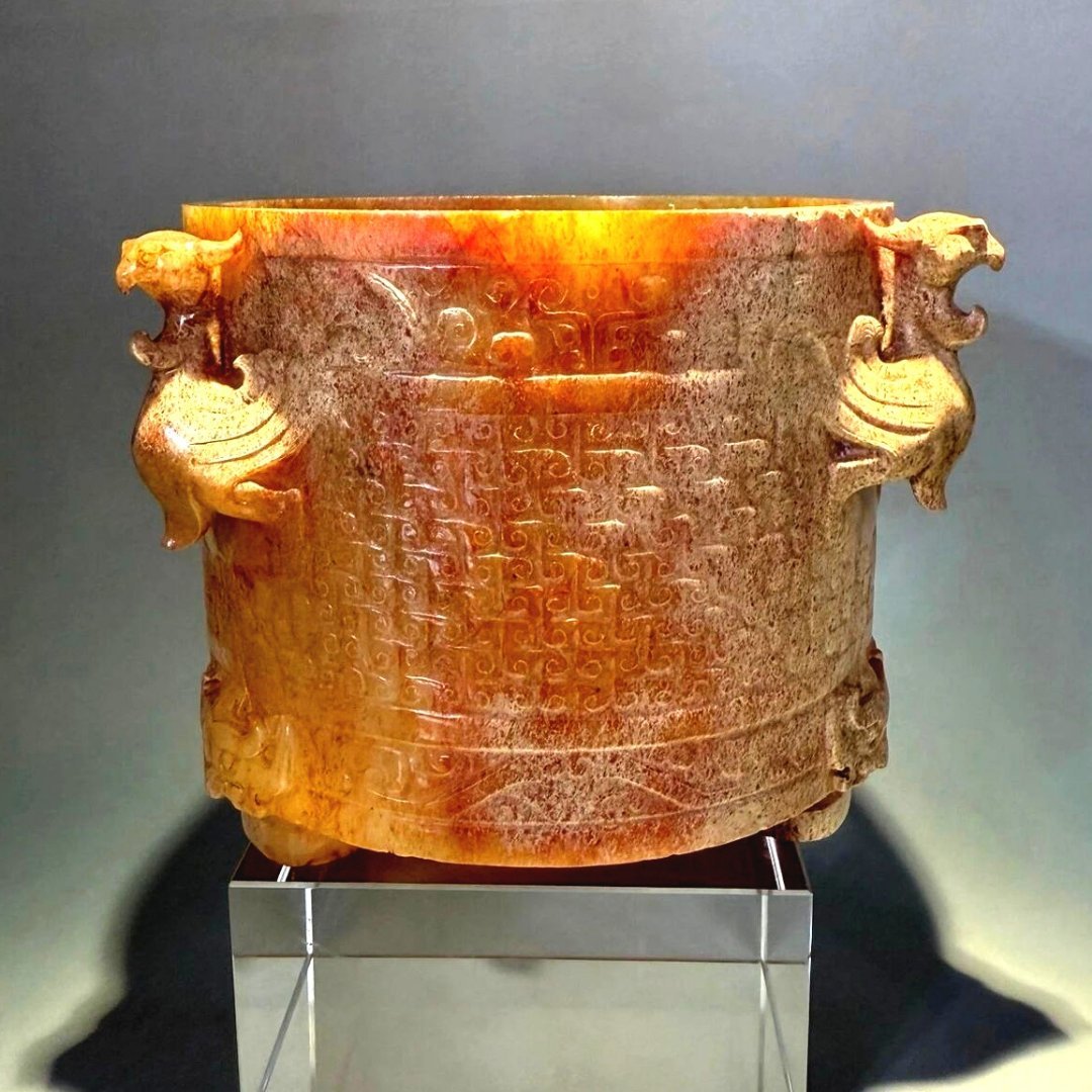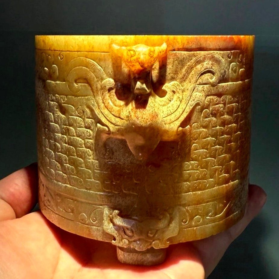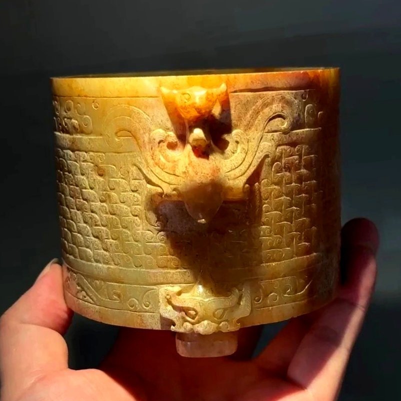 古玉杂谈 是成酒器?又不像。是香炉?可能性更不大,汉代的凤鸟作耳手,真没见到过,雕工如此复杂精道,想不明白,究竟在古代作什么用的? 上饶·古埠镇