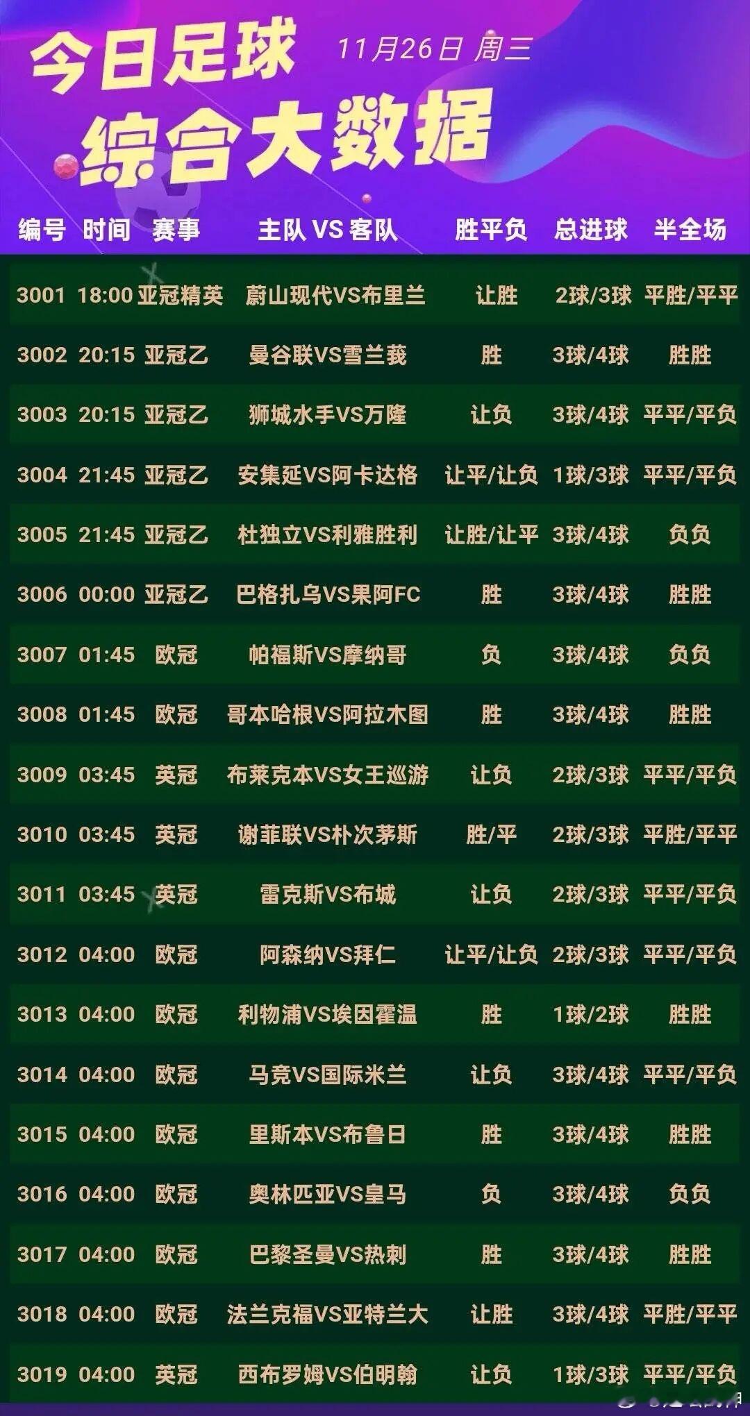 11月26日001 蔚山现代 VS 武里南002 曼谷联 VS 雪兰莪003 狮城水手 VS 万隆004 安迪江 VS 阿卡达005 杜尚别独立 VS 利雅得胜利006 阿尔萨乌拉 VS 果阿邦007 帕福斯 VS 摩纳哥 008 哥本哈根 VS 阿拉木图凯拉特009 布莱克本 VS 女王巡游010 谢菲联 VS 朴茨茅斯
