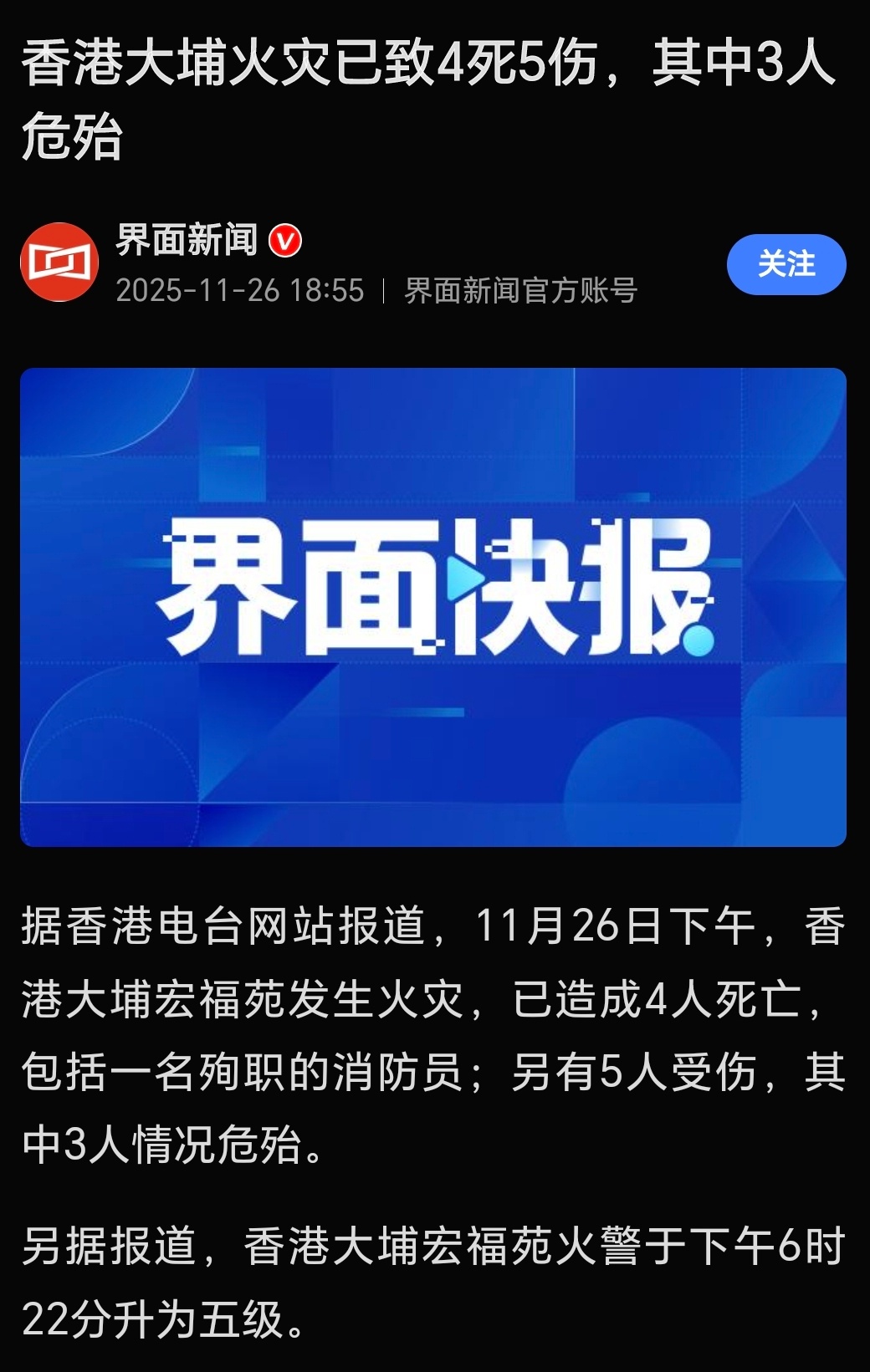 香港火灾香港大埔宏福苑火灾造成重大伤亡,一名消防员在救援中不幸殉职,令人痛惜。愿逝者安息,伤者早日康复!火势迅速升级至五级,与楼宇外墙维修棚架密切相关,公共安全容不得一丝疏忽!热点观点