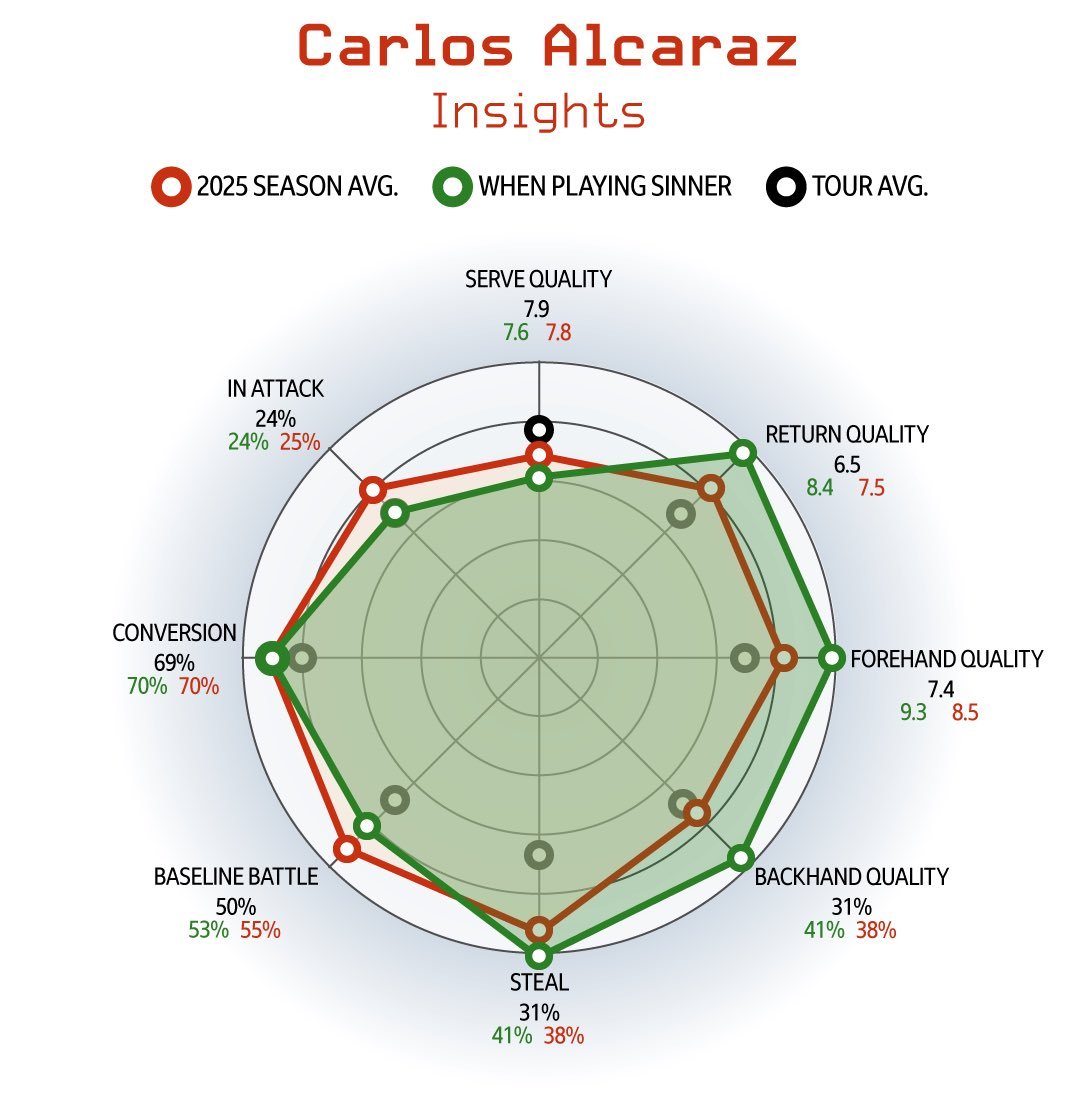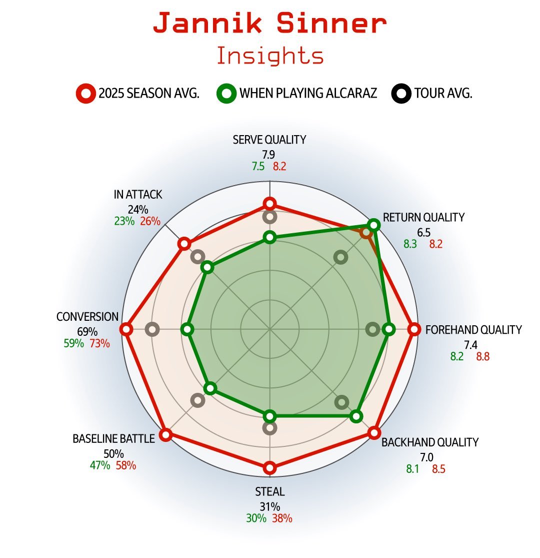 为什么辛纳的能力看似足以碾压一切,但偏偏在与阿卡的对决中落在下风?这组统计对比,值得数据控们好好研究。图中八个项目分别是发接发、正反手、进攻性、底线得分率、进攻转化率(conversion)、防反成功率(steal)。绿点代表阿卡辛纳面对彼此时的发挥水准,红点代表他们所有比赛的平均水准,黑点则是巡回赛所有球员的平均水准。这么一比就有意思了,辛纳面对阿卡时,除了接发球表现有所提升,其他七个环节全面缩水,而且是大幅度下滑,除了正反手之外其他五项竟然跌到了低于巡回赛平均值的水准。而当阿卡面对辛纳时,他的正反手、接发、防反成功率都有大幅度提升,只在发球、进攻性和底线得分率三项出现小幅下降。考虑到辛纳的正常状态过于恐怖,红点分布几乎接近正八边形战士,遇到阿卡出现回落在所难免。毕竟阿卡带给他的对抗强度,远超其他对手。但问题是,阿卡的表现该如何解释呢?打别人也就中规中矩,打辛纳立马各种拉满。。。就,只能归结为“浪性”了吧?还是那句话:能力不详,遇强则强