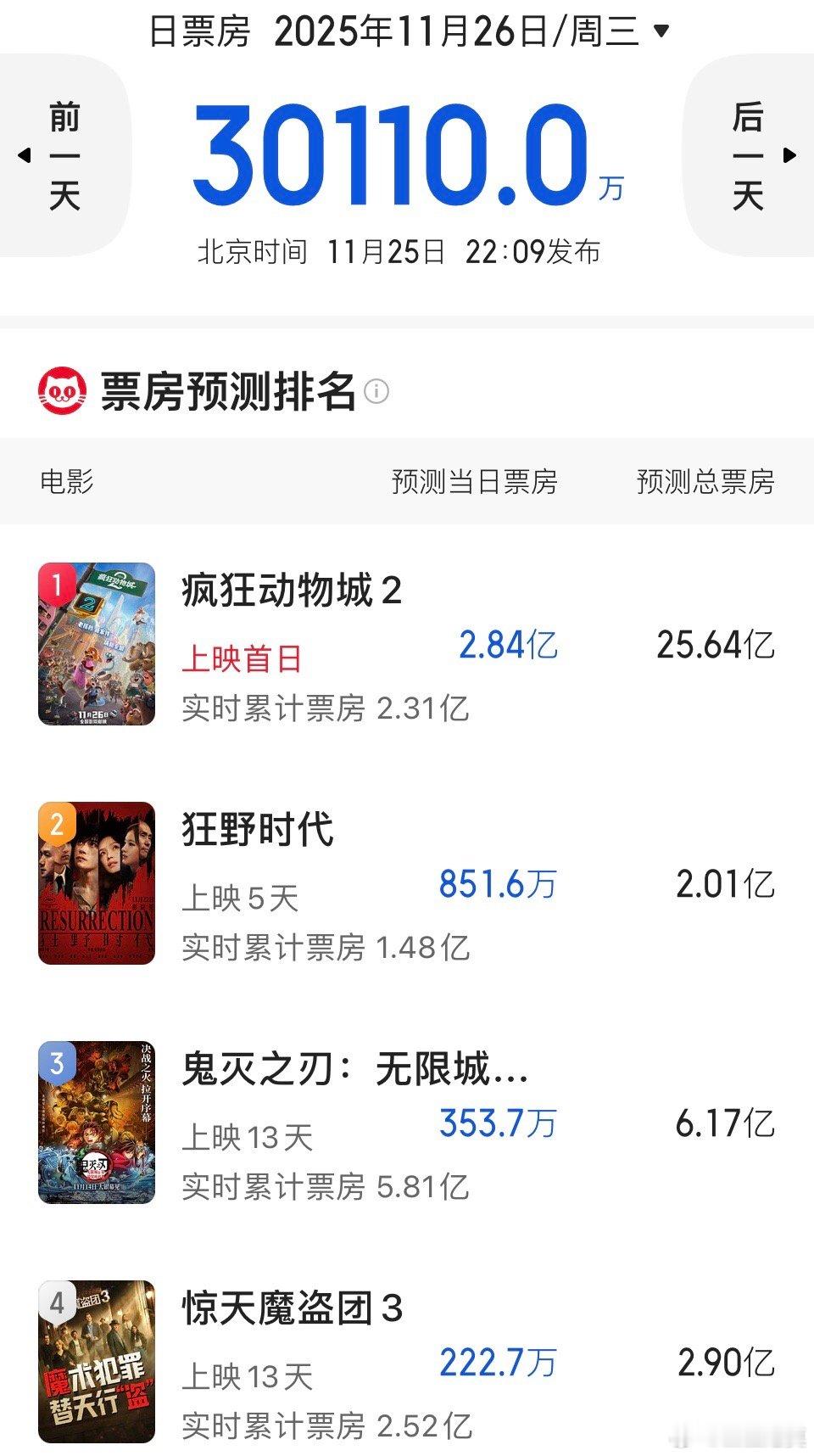 平台给《疯狂动物城2》首日的预测票房2.84亿,这也太高了。目前看,2.5亿都有难度。《疯狂动物城2》实时票房2.3亿。