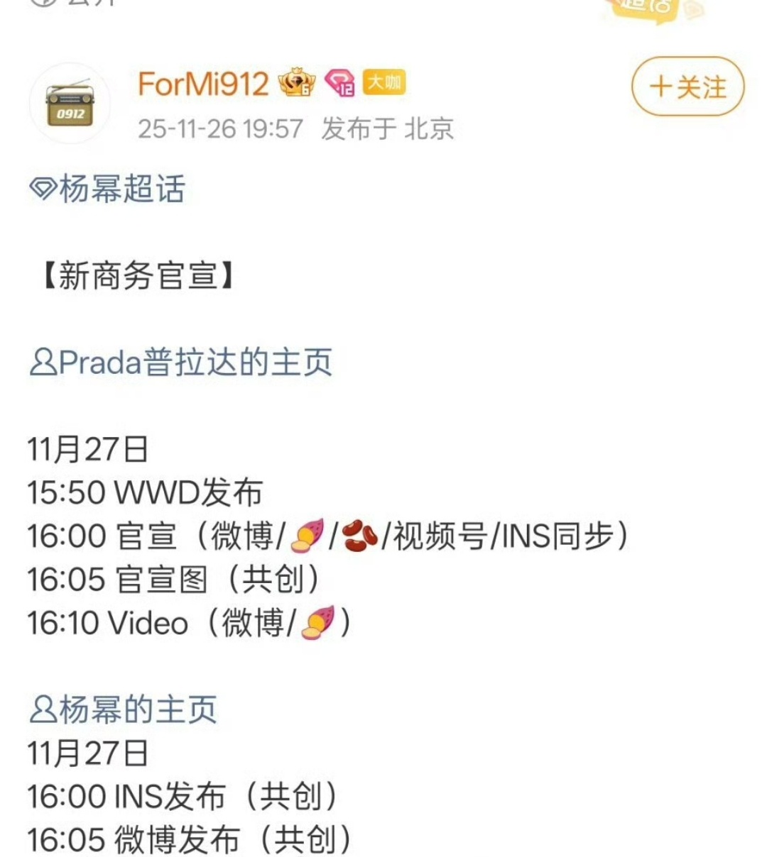 杨幂 PradaPrada正式宣布演员杨幂担任其品牌代言人。此次合作涵盖全球地广、广告及杂志封面等顶级资源,标志着杨幂在影视与时尚领域的双重影响力获得国际认可。