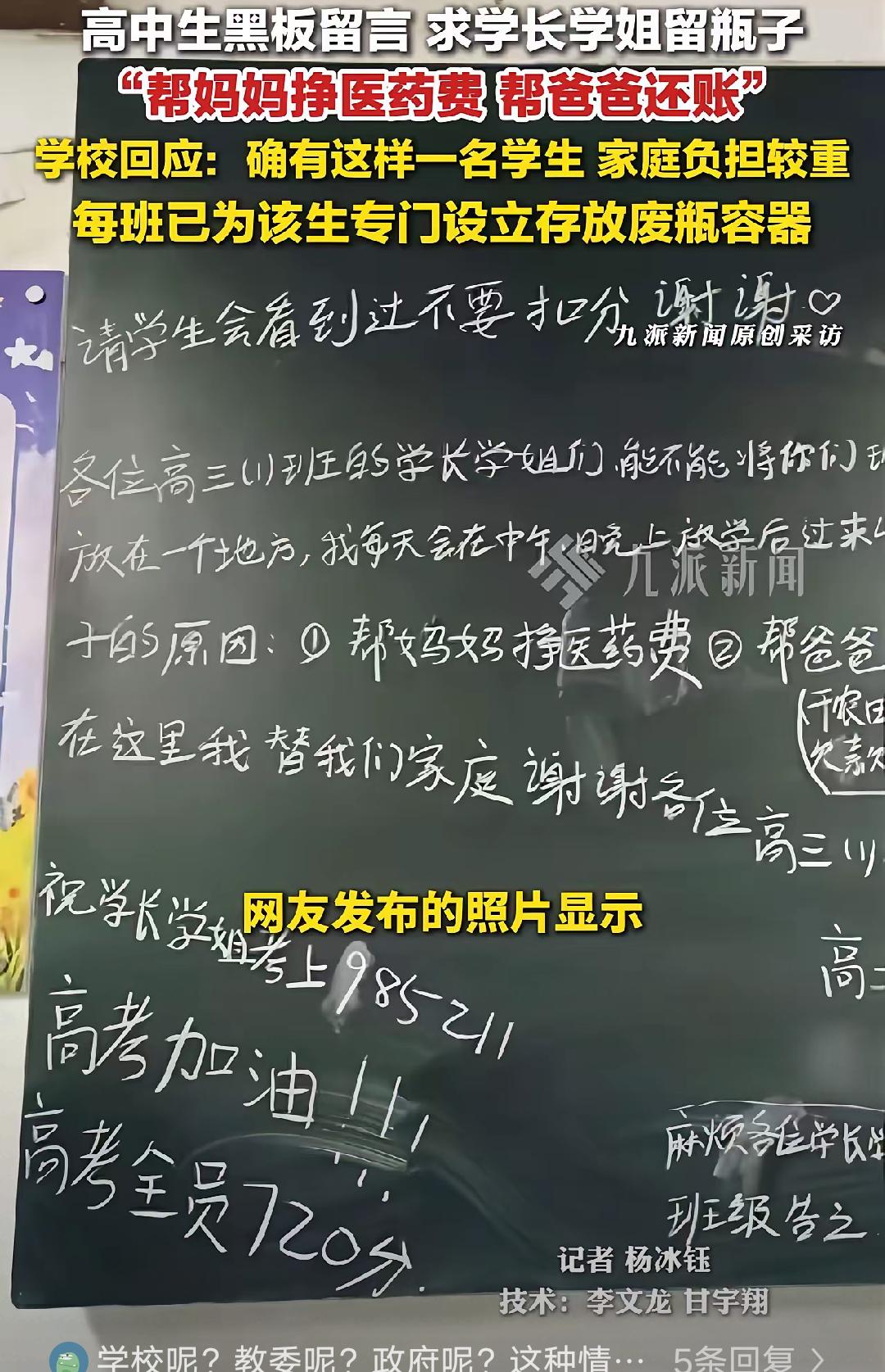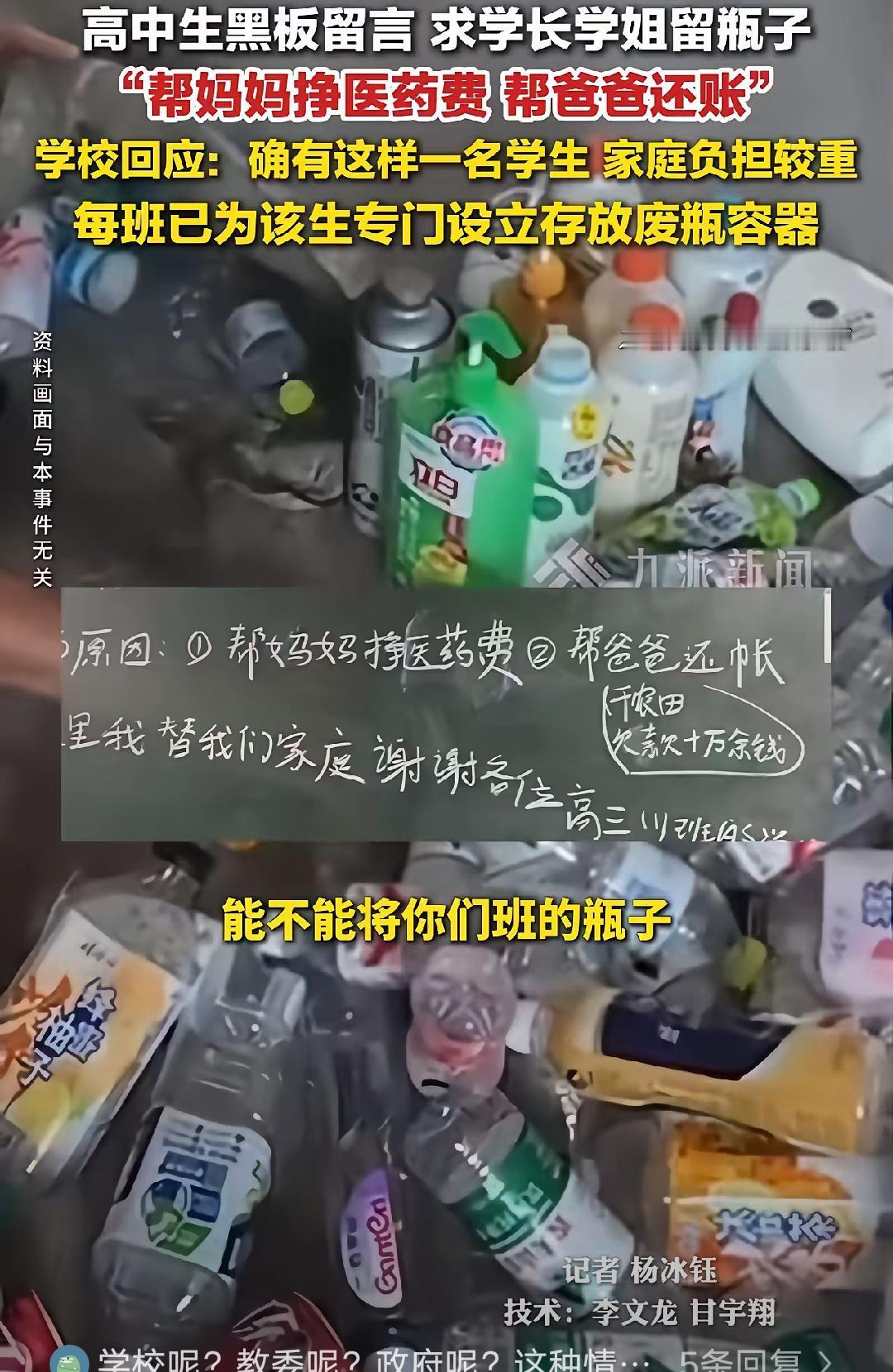 收瓶子男孩的尊严, 比十万债务更重。 他写在黑板上的每一笔, 都是挺直的脊梁。 面对母亲医药费和父亲务农欠下的债务,这个高二学生没有伸手乞讨。他选择在放学后去各个班级收集空瓶子,用双手一点点分担家庭的重量。学校在每个班级设置了专门的回收容器,这种默契的支持,守护了他用劳动换回报的尊严,这比单纯的捐款更显可贵。当生活的重量压在肩上,有人选择弯腰,有人选择挺直。这个男孩和学校的做法,共同诠释了什么是真正的担当。创作训练营开营啦