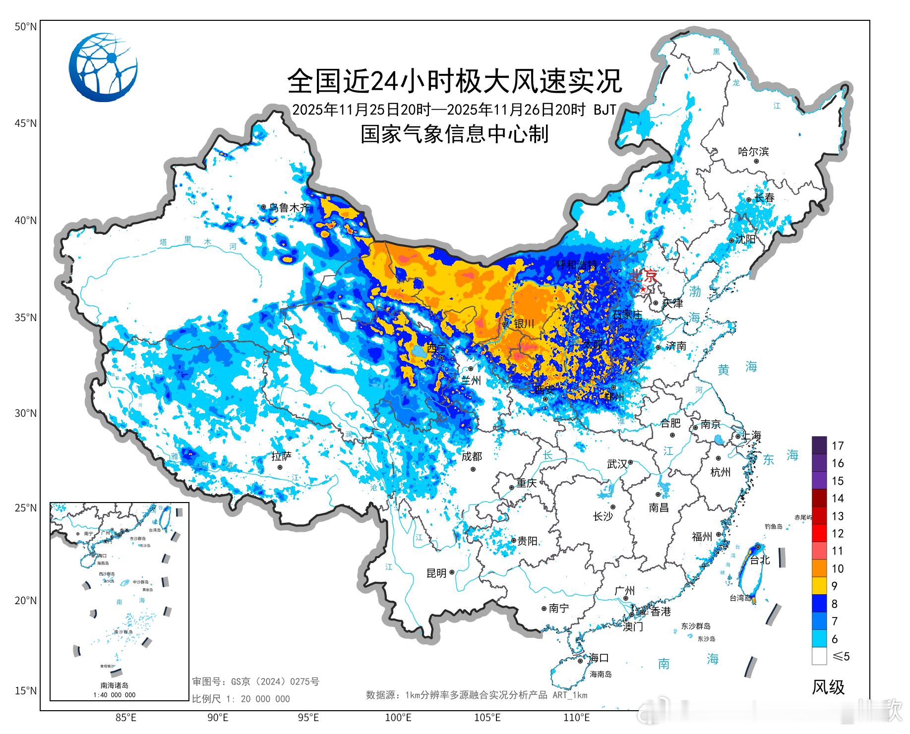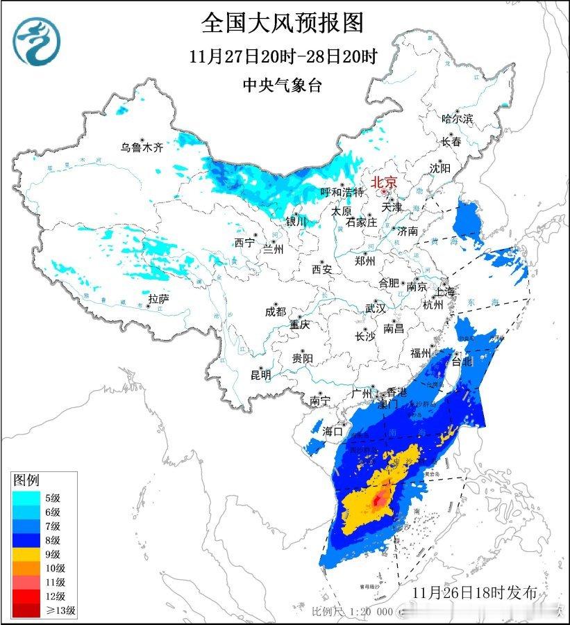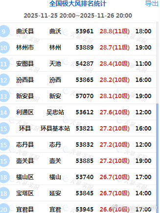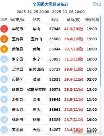 【大风】今天西北地区东部多地出现8-11级阵风,局地12-13级。陕西华山41.3米/秒(13级),为全国阵风最强站点。另外部分站点阵风打破当地观测史纪录:陕西黄陵32.7米/秒(12级)、山西乡宁31.1米/秒(11级)、陕西志丹27.2米/秒(10级)。山西五台山36.6米/秒(12级)等站点打破11月阵风纪录。今晚到明天,冷空气东移,甘肃、内蒙古、宁夏、陕西、山西的风总体会减弱。但华北黄淮等地将有5-7级风,阵风8-9级。此外明天和后天,在新一股冷空气到来前,甘肃西部和内蒙古西部一带,可能还有大风天气。回暖后有暖低压发展,气压梯度大,且依然有高空动量下传。此外冷空气入海+台风天琴,东部和南部海区也多大风。