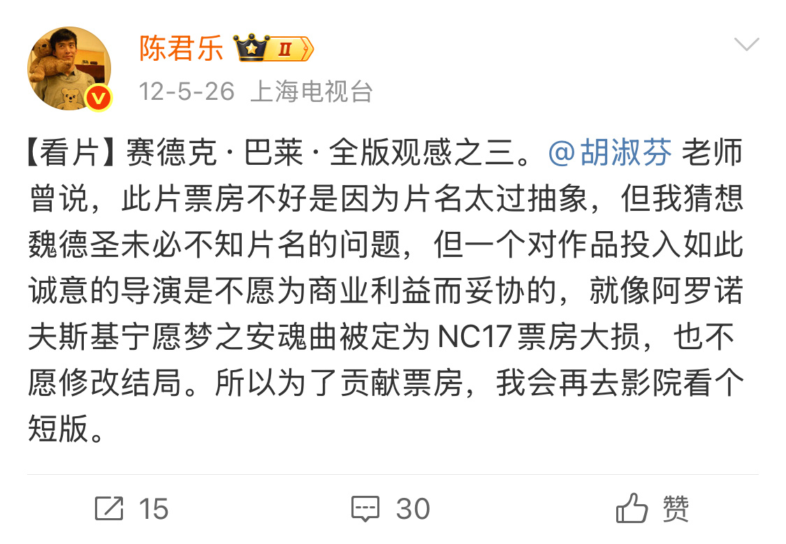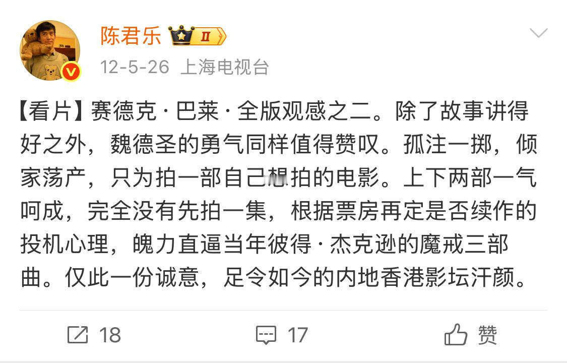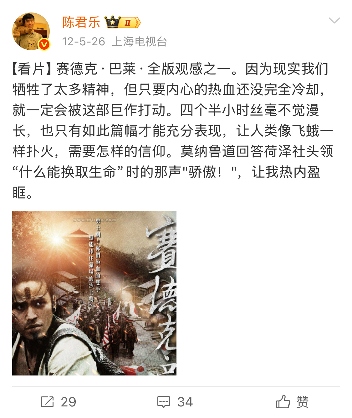 每日一片 《赛德克·巴莱》(2011)今天电影圈最大的新闻,应该就是魏德圣导演的封圣之作《赛德克·巴莱》上下两部,将于下个月登陆内地院线。2012年曾经上过一个130分钟的合集版,但用四小时足版,在影院全景重现1930年台湾原住民抗击日本殖民者的“雾社事件”,这还是第一次。在近期台海形势的大背景下,如此大手笔,意味相当明确了。当年第一次看这两部史诗之作时,还没有开启《每日一片》的推片专题,微博也还有140字的发帖限制。结果一激动来了个一日三片,连发了三个影评帖,才能一抒胸意。所以你们能想象当时的观感有多么震撼吗?那还是在卧室电视机上的观影效果。十多年后,终于有机会在大银幕上重温,我先提前补上一个五星好评。12月12日上集公映,12月13日下集公映,到时候去贡献一把票房吧,哪怕无关国事,只为纯粹的艺术欣赏,也是不容错过的机会。(9.0/10)