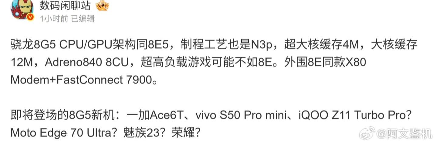 跑分:8E5>8Gen5>8E实际:8E5>8E>8Gen5CPU Prime大核缓存从8E5/8E 12MB阉割到4MB,GPU从8E5/8E 12CU阉割到8CU。如果大家看不懂的话,8e5叫至尊版,8g5比8e5性能低,可以被看成“低至版”,未来8sgen5性能更弱,可以被看成“弱至版”,到时候至尊版,低至版,弱至版,这样叫应该就看得清吧?数码科技评论