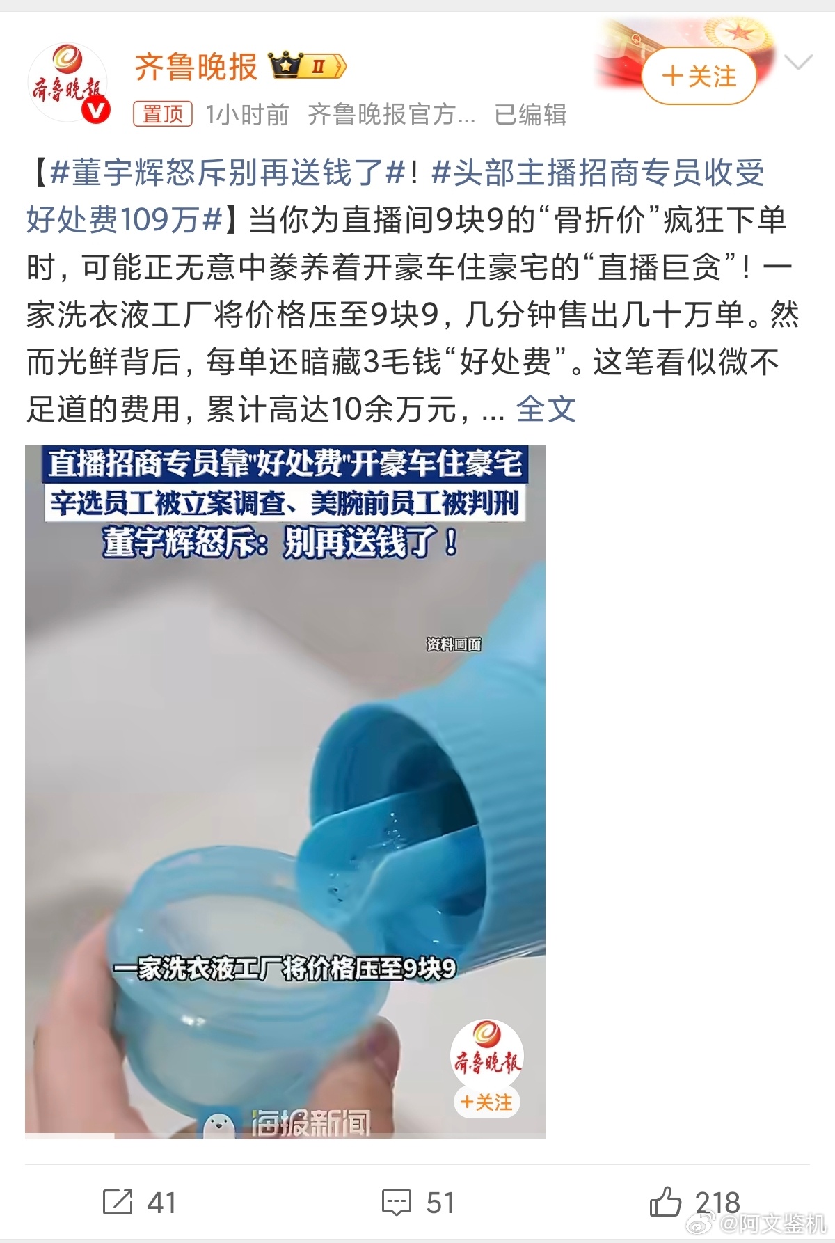 董宇辉怒斥别再送钱了董宇辉喊话别再给他家专员送礼了,一单9.9还包邮的洗衣液专员还能提成3毛,主播还有佣金,还要给大主播坑位费,不敢想象这玩意利润有多高,特别是现在电商税实施起来,这种低价产品还有品质可言吗?
