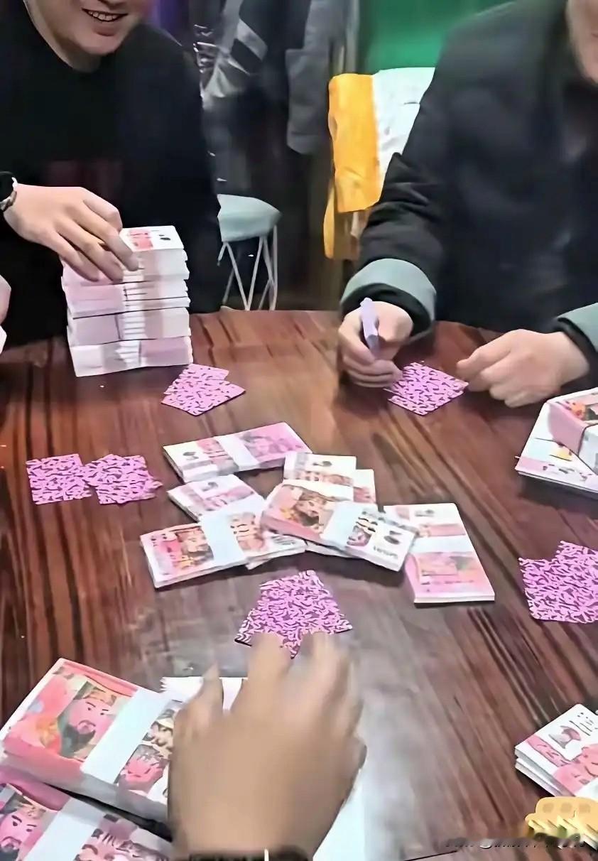 这样打牌估计都不想赢吧,越赢越不吉利。你想啊,谁愿意大包小包的带一堆冥币回家?尤其是深夜回家的时候,家里面老婆绝对会认为你娃遇到阿飘了!不过看这帮人玩儿的这么开心,我觉得只有两种情况:1、纯纯地摆拍行为,就为图个乐。2、要么就是瞒天过海,一捆代表一万,然后拿冥币兑换成真钱结算,这样既可以过瘾,又规避被请去喝茶的风险。