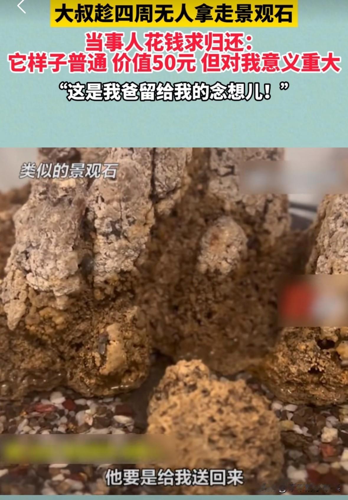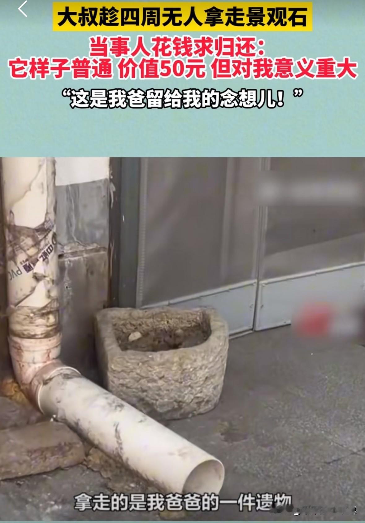 大叔趁着四周无人,拿走男子家门口一个观景石,男子花钱求归还。 男子说:“这个东西是我爸爸的一个遗物,睹物思人的遗物,就是价值50块钱的东西,他要是给我送回来,我给他200元,甚至更多都行。” 既然你把你爸的遗物视若珍宝,为什么还要把它放在大门口? 直接放屋里当摆件多好,自己能天天看到,又不怕丢! 你把这石头放门口,别人都以为是不重要的东西,所以顺手牵羊了,这就跟放在门口的纸壳子差不多。路边大石头