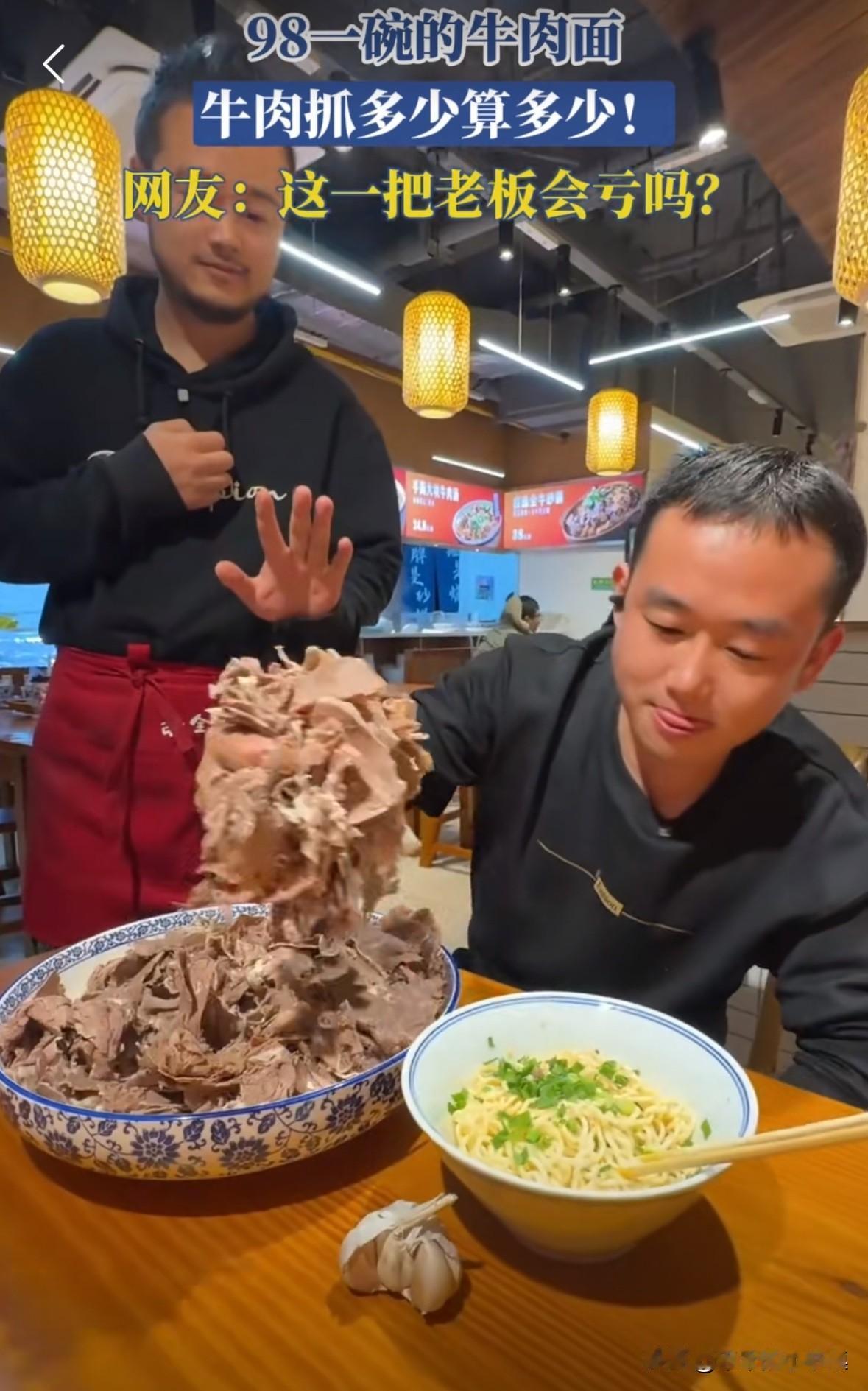江苏一家店里的牛肉面98元一碗,牛肉一只手能抓多少就给多少。 男子一只手抓了一整碗牛肉,工作人员:“恭喜。”然后笑着离开了! 男子看似是占便宜了,其实是吃亏了。 一斤牛肉顶多三四十块钱,男子抓的就算一斤好了,老板还净赚50多。 不得不说,这老板太有经商头脑了,这样有趣的吃面方式,肯定会吸引来很多顾客! 玩的就是心理战。