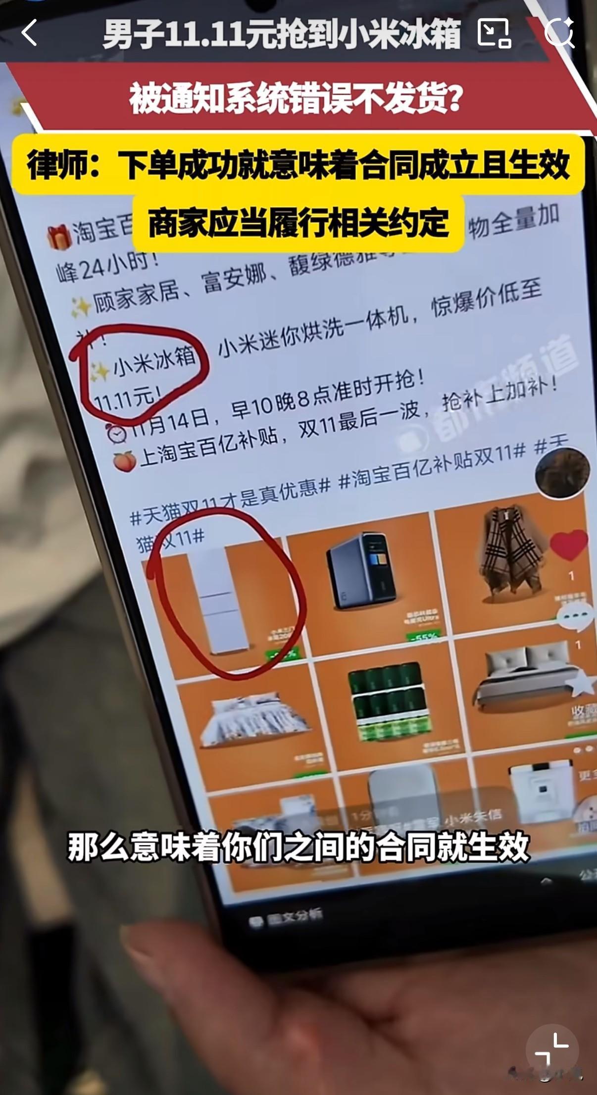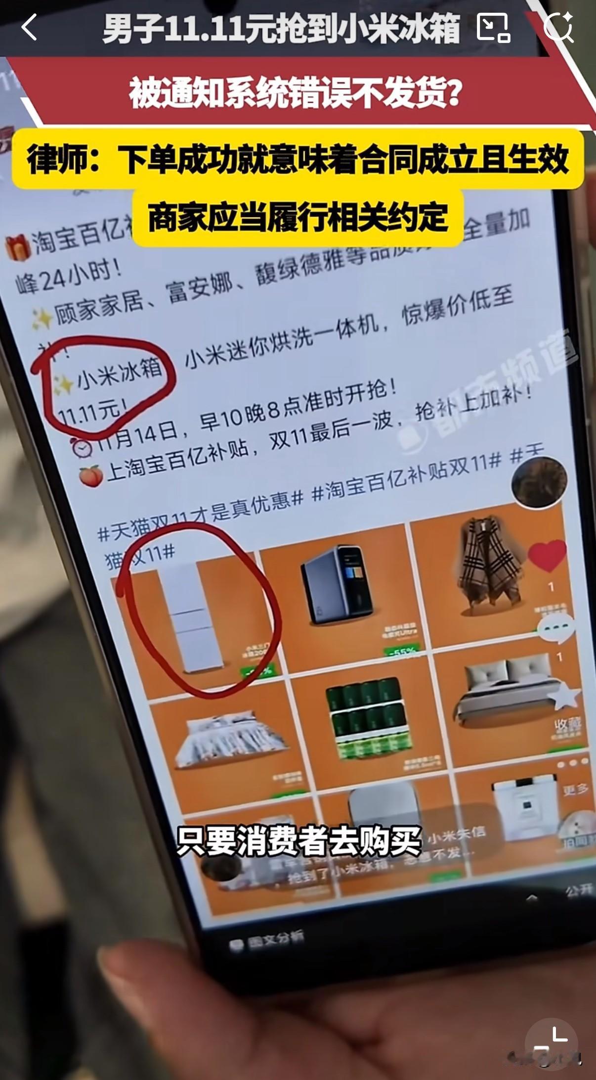 11元抢到小米冰箱,商家一句"系统错误"就不发货了! 双十一那天,广东的彭先生紧盯着手机屏幕。小米官方旗舰店的秒杀活动页面上,原价1499元的冰箱只要11.11元。 他准时点击购买,付款成功。订单页面清晰显示"秒杀成功",还标明了预计发货时间。 同样幸运的还有河南的张先生。他也在同一时间抢到了这台超低价冰箱,兴奋地截图发了朋友圈。 等待几天后,他们没等到冰箱,却收到一条短信:"因系统配置错误,订单取消,补偿30元红包。" 彭先生立刻联系客服。客服反复解释:"系统配置问题,导致库存异常。" 彭先生追问:"为什么支付能顺利完成?页面明明写着秒杀成功即发货。" 客服仍然坚持:"确实是系统问题,无法发货。" 张先生更加愤怒:"玩不起就别办活动!卡点抢购的辛苦被30元打发,这让人难以接受。" 淘宝平台客服后来表态,认为商家应该履行发货义务。但平台内部人员推测,因为成交价远低于成本,商家可能宁愿接受处罚也不愿意发货。 类似的电商价格乌龙事件时有发生。不久前,多个消费者在蕉内官方小程序抢到22元的特价商品,最后订单都被取消。 还有消费者反映,曾经以优惠价抢购到的扫地机器人,在运输途中被商家强行拦截退回。 法律专业人士分析,消费者提交订单并付款成功后,买卖合同就已经成立。除非商家能够提供系统故障的技术证明,否则单方面取消订单涉嫌违约。 电商平台经常用低价活动吸引流量,可一旦出现标价错误,商家往往选择赔偿也不愿意承担损失。 有消费者表示,如果真是系统问题,为什么不能提供技术报告来证明?而是简单粗暴地取消订单。 一台冰箱的价值,与消费者对品牌的信任,哪个更重要?这值得商家深思。 电商促销活动频频出现类似问题,消费者的权益该如何保障? 各位读者,你们遇到过类似情况吗?觉得商家应该怎么做才合适? (消息来源:都市报道)