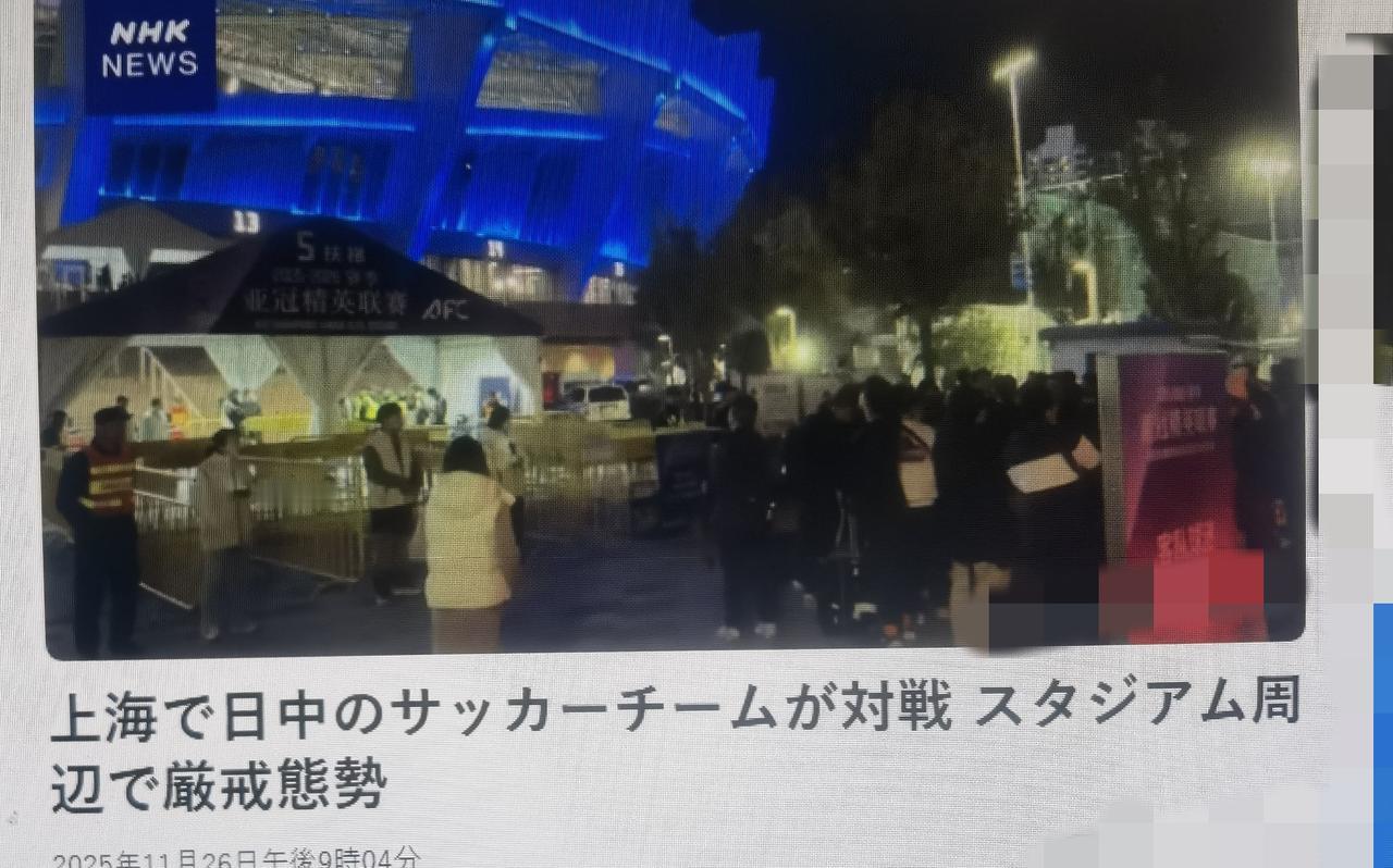 上海中日足球队对决 体育场周边戒备森严 日媒11月26日报道,在日本高市首相就所谓"台湾有事"发表国会答辩引发中方强烈抗议的背景下,26日晚上海将举行日本足球队与当地球队的对决,体育场周边已实施严密警戒。26日晚,上海将举行亚洲冠军联赛精英赛,决出亚洲顶级足球俱乐部,日本J1联赛的神户胜利船队将迎战上海球队。 26日当天,体育场周边部署了大量警力,并临时设置了金属围栏等,呈现高度戒备状态。 作为安保措施的一部分,日本球迷需乘坐专用大巴进入体育场。 一位从日本前来观赛的球迷表示:“最重要的是比赛能平安结束,大家安心回国。政治归政治,体育归体育,希望双方能奉献一场精彩比赛。”日本驻上海总领馆呼吁前来观赛及在沪日本民众,外出及乘坐公共交通时务必保持“警惕”,观赛期间应遵从主办方和安保人员指示,避免向对方球迷挑衅滋事。