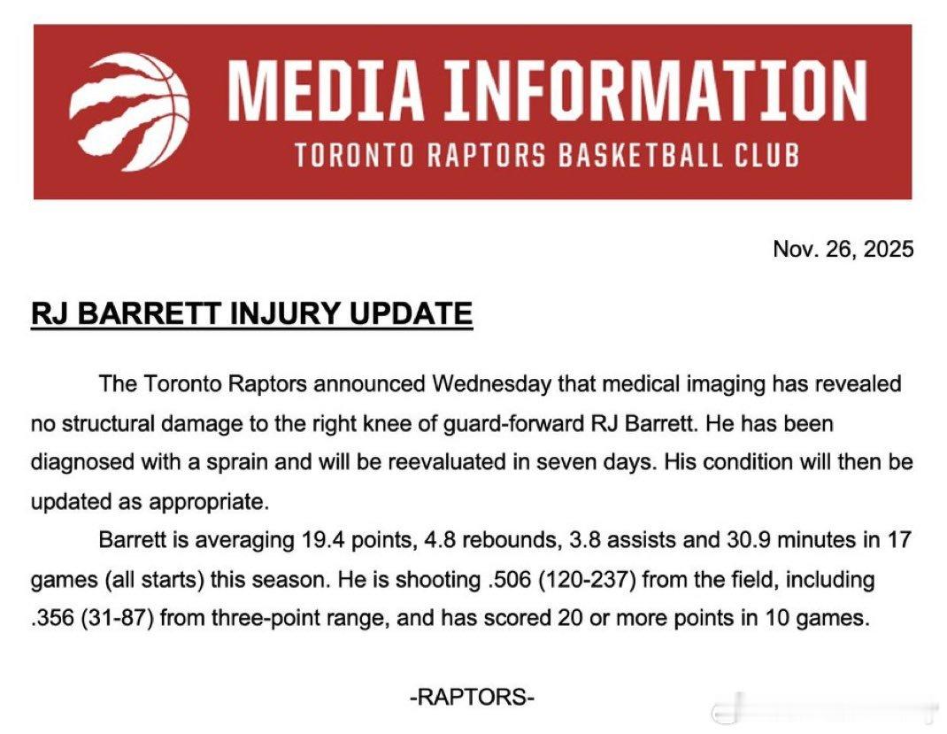 RJ巴雷特右膝扭伤,将于7天后重新评估。巴雷特本赛季场均出战30.9分钟,贡献19.4分4.8篮板和3.8次助攻。他将缺席对阵步行者、黄蜂和尼克斯的比赛。目前猛龙8连胜排名东部第二。