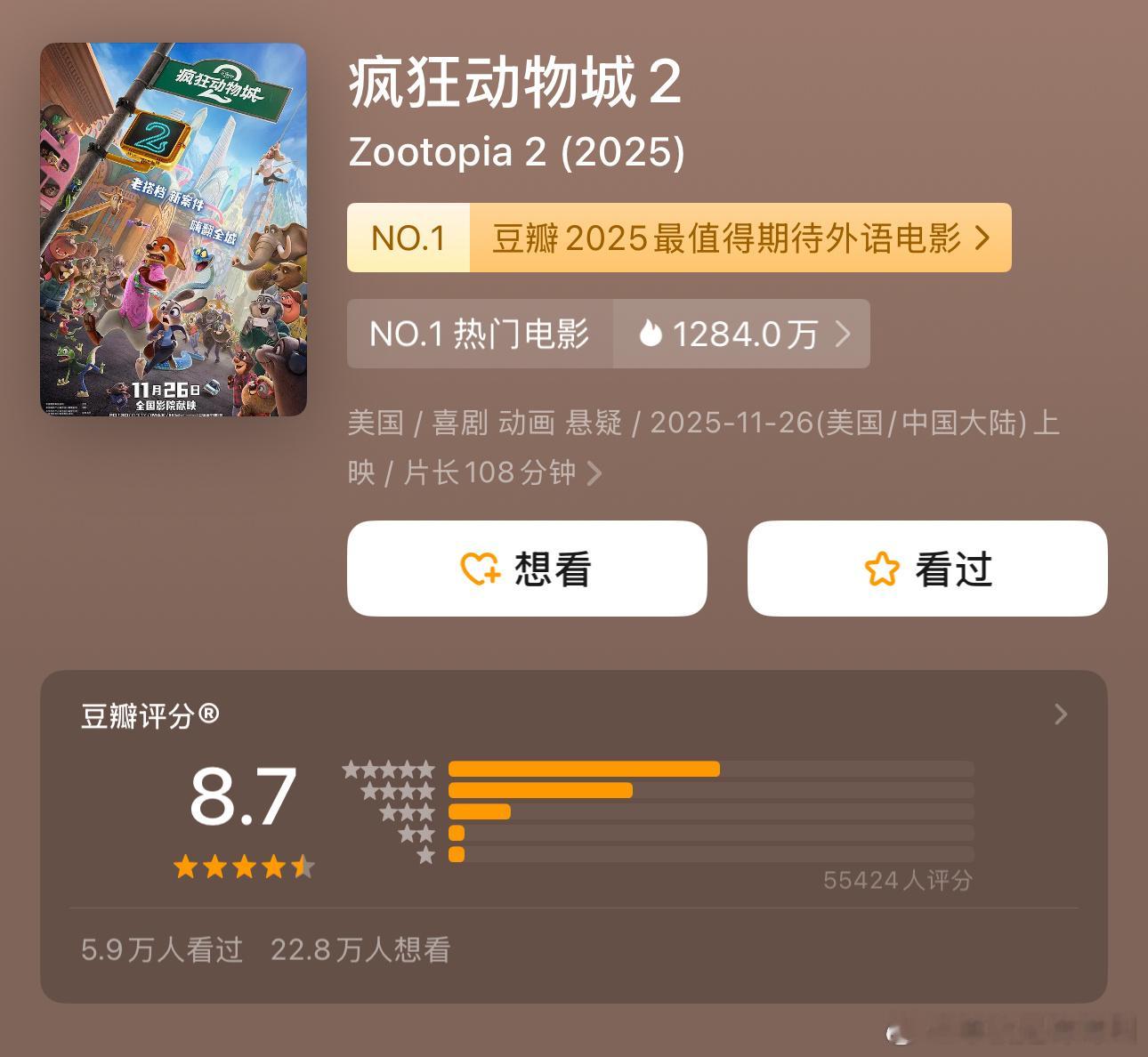疯狂动物城2开分 将近6w人打分,疯狂动物城开分8.7,感觉这个分数差不多啊